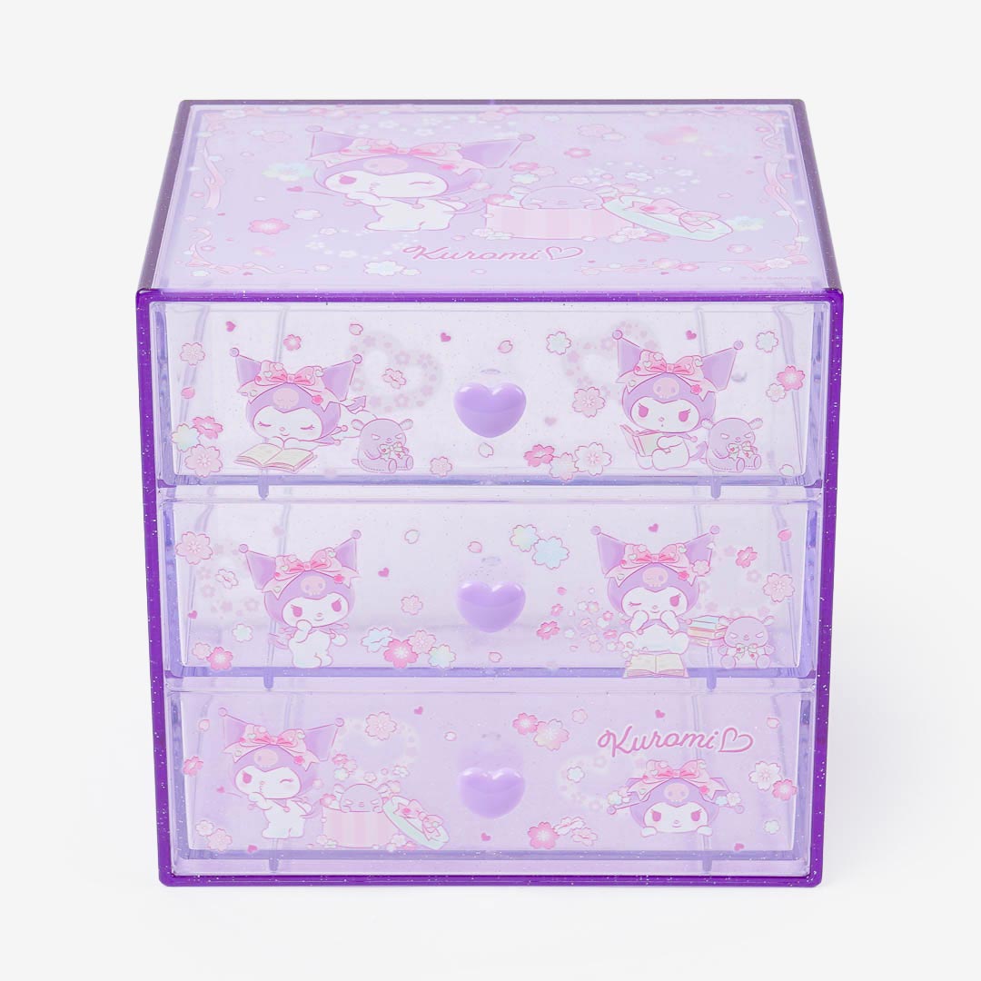 Keep your workspace tidy with this super cute mini drawer chest! Its transparent and glittery design showcases Kuromi with sakura or cherry blossoms. This chest has three mini drawers perfect for organizing small items on your desk!