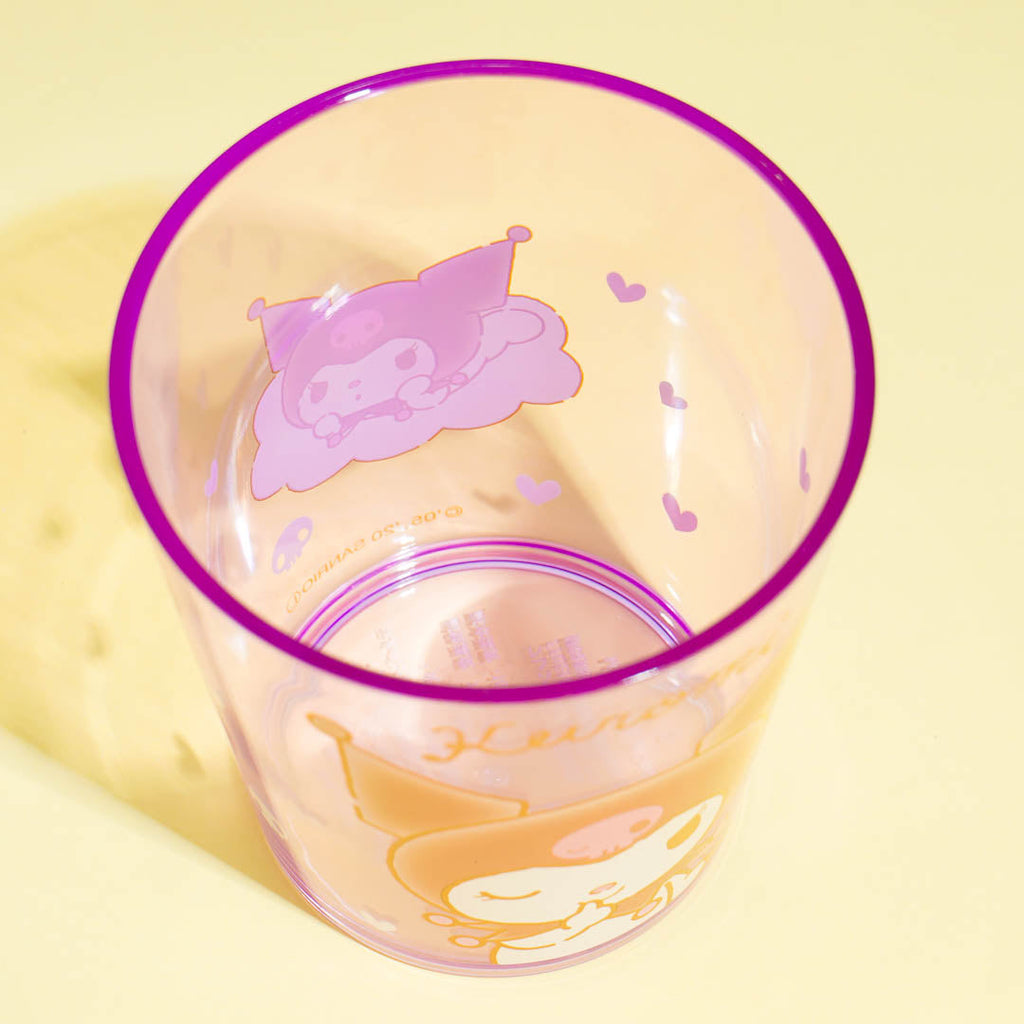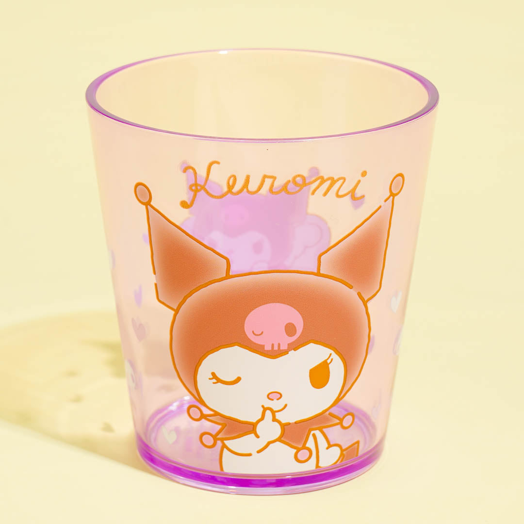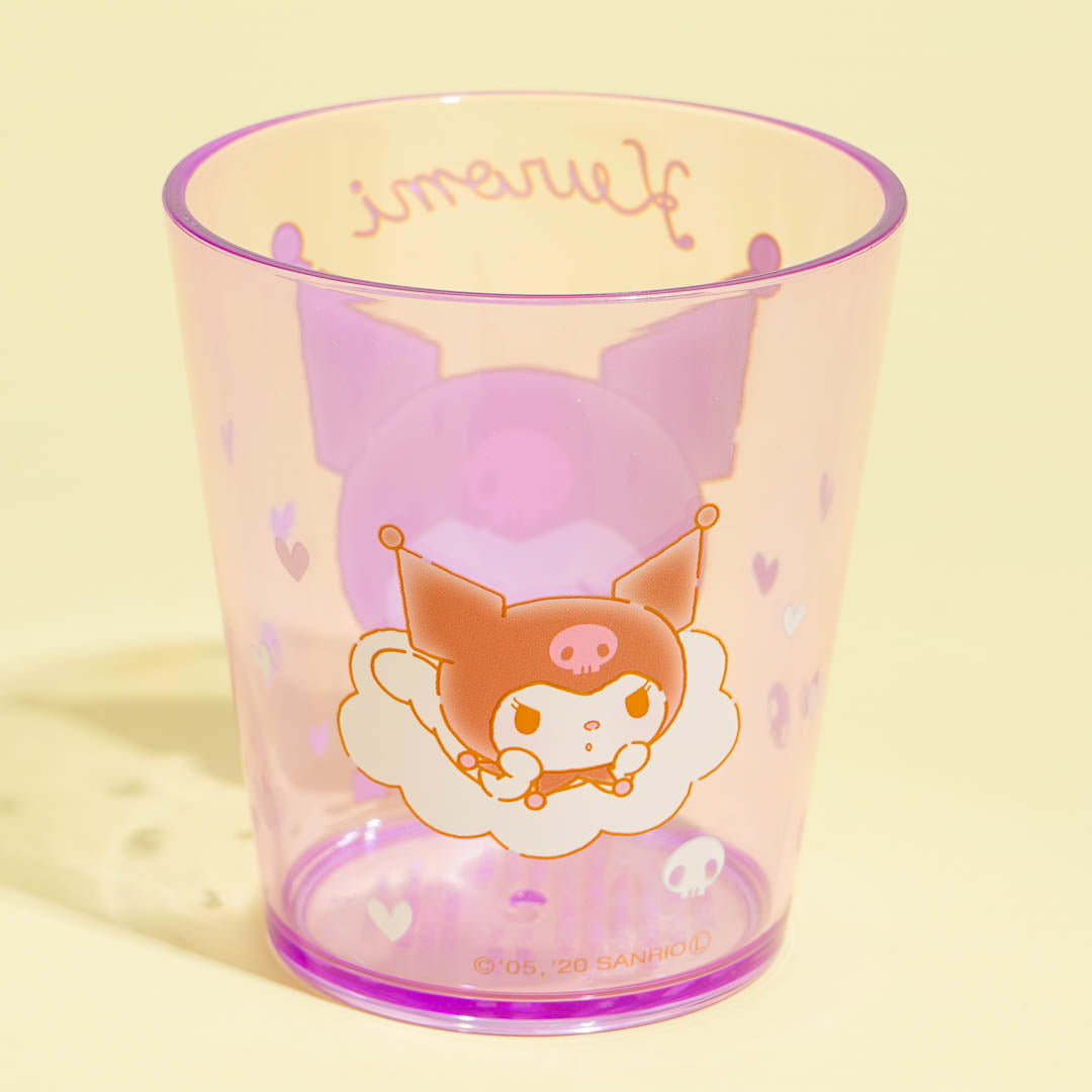 Pour your favorite drink into this kawaii plastic cup. It showcases a print of Kuromi gesturing for you to keep a secret! On the other side of the cup is Kuromi making a kissy face.