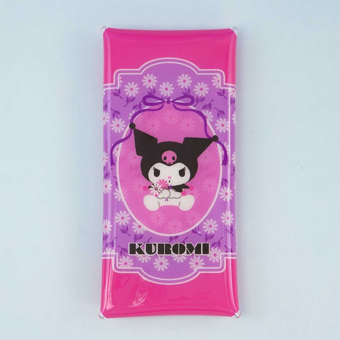 A pink multi-purpose case with a vintage-like illustration of Kuromi and flowers