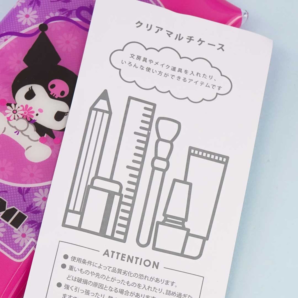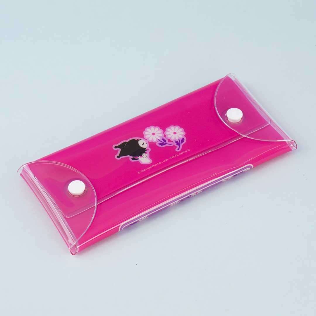 Use this cute multi-case to organize your wired earphones! It has a retro-inspired print of Kuromi surrounded with spring flowers! This pink case is made of transparent plastic and has dual snap button closures.