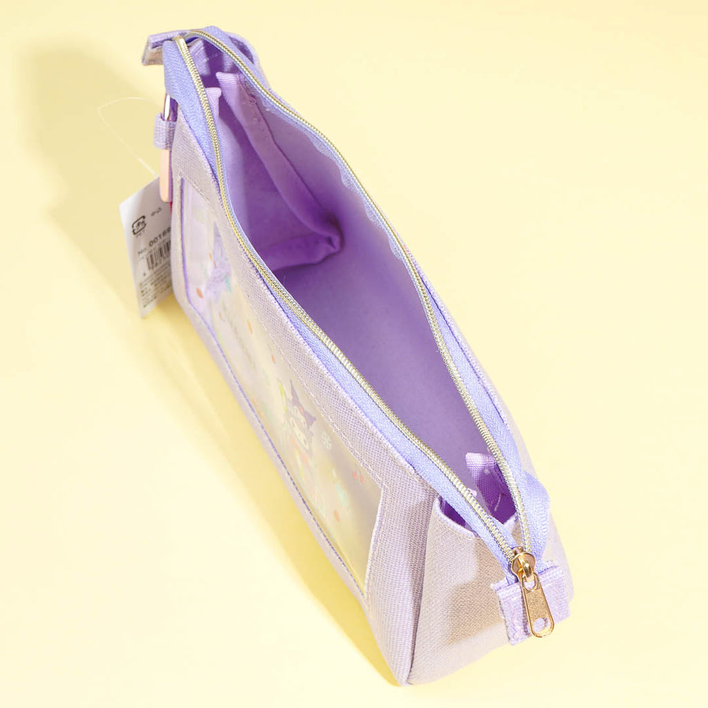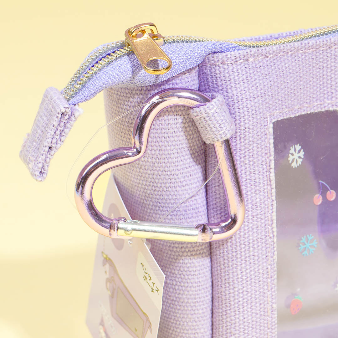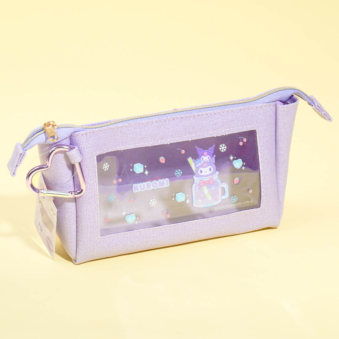 Store your pens or makeup brushes inside this super cute pouch! It’s made of canvas material and has a clear window opening decorated with a print of Kuromi and her favorite soda. It also comes with a heart-shaped metal carabiner to attach to your backpack!