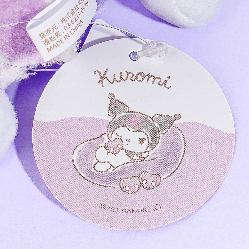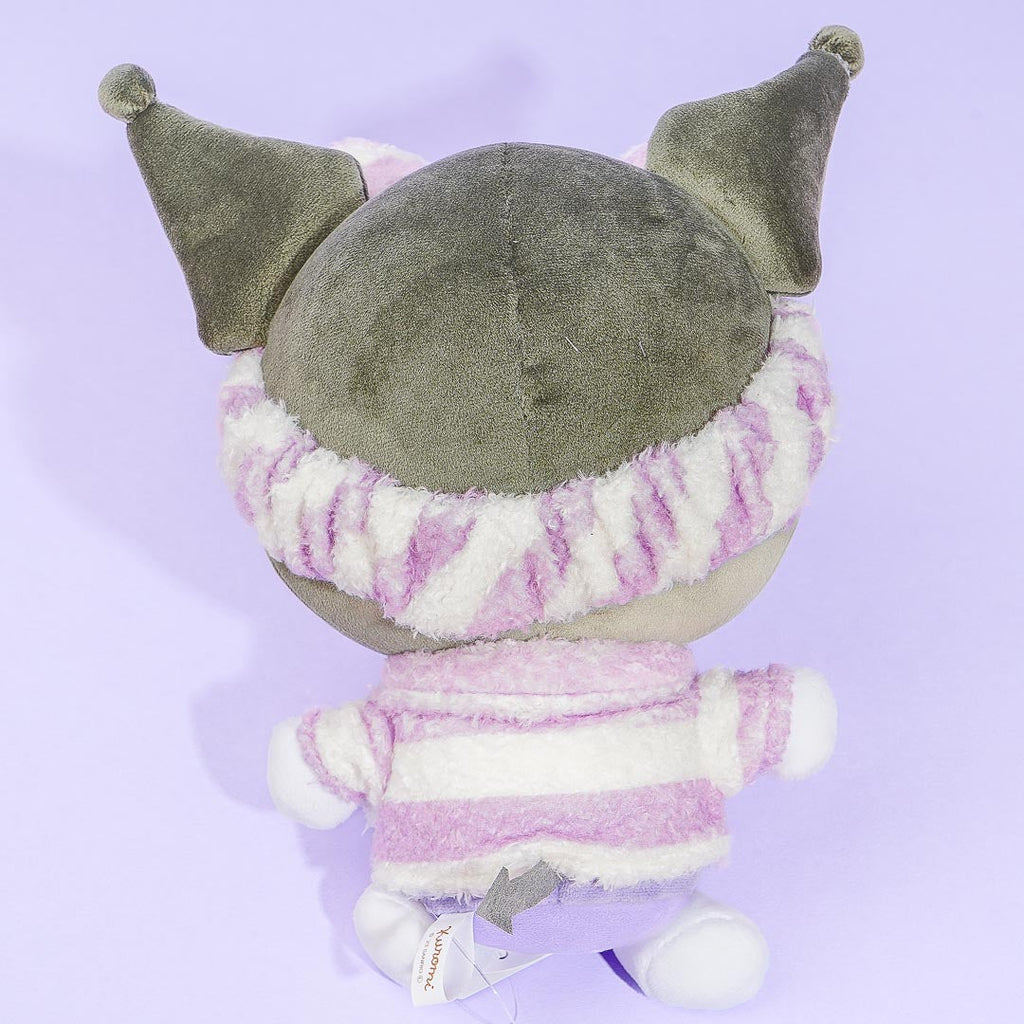 Take a relaxing nap while snuggling with this super kawaii Kuromi plushie! This medium-sized cutie is wearing a striped fuzzy spa dress with a matching ribbon turban.