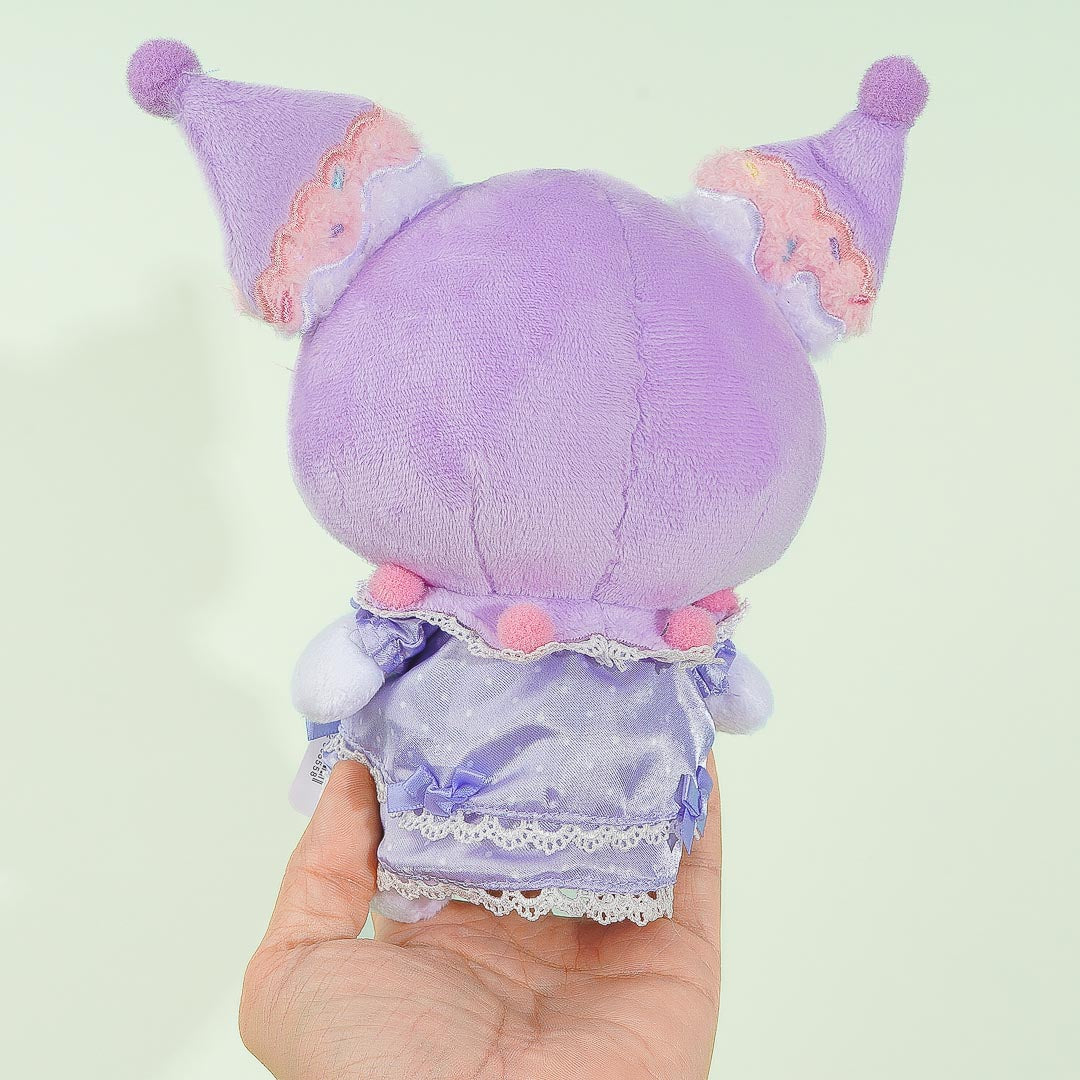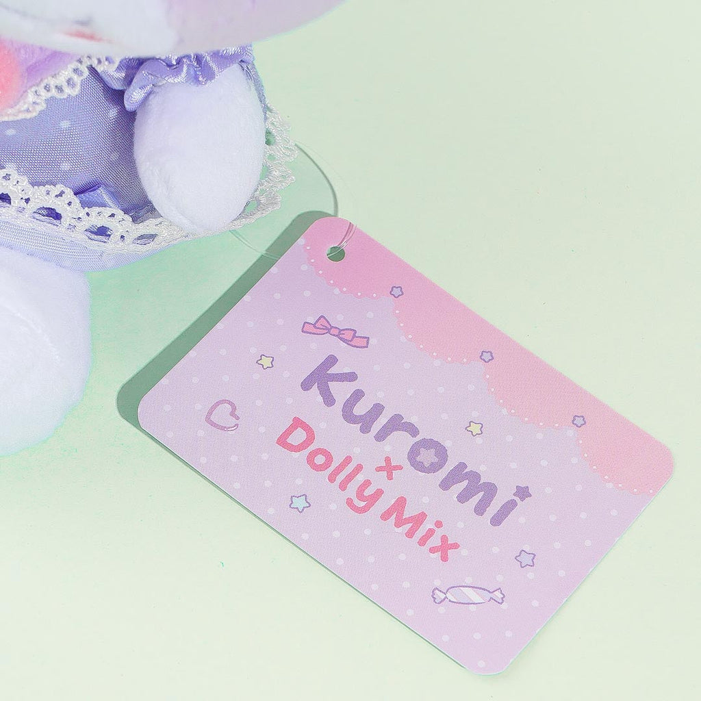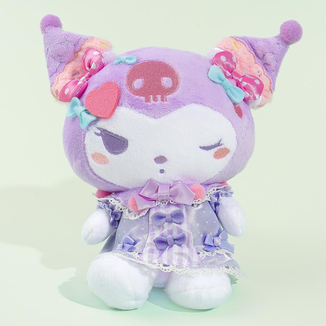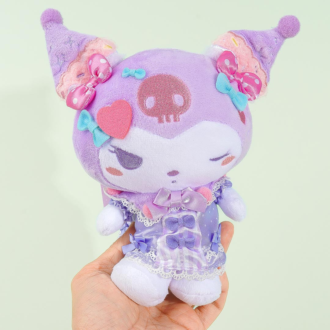 Have fun playing with this medium-sized plushie! Kuromi is wearing a super cute Lolita dress that's filled with ribbons and lace. This stuffed toy comes from a collaboration between Sanrio and Dolly Mix.