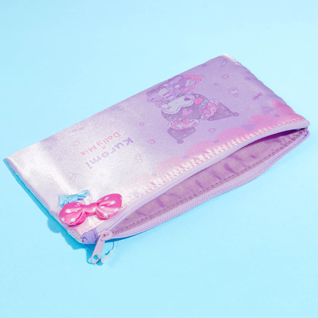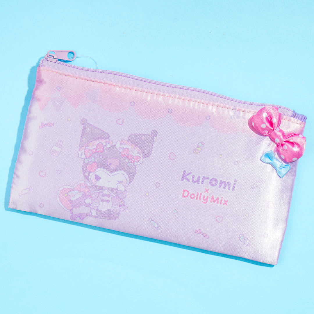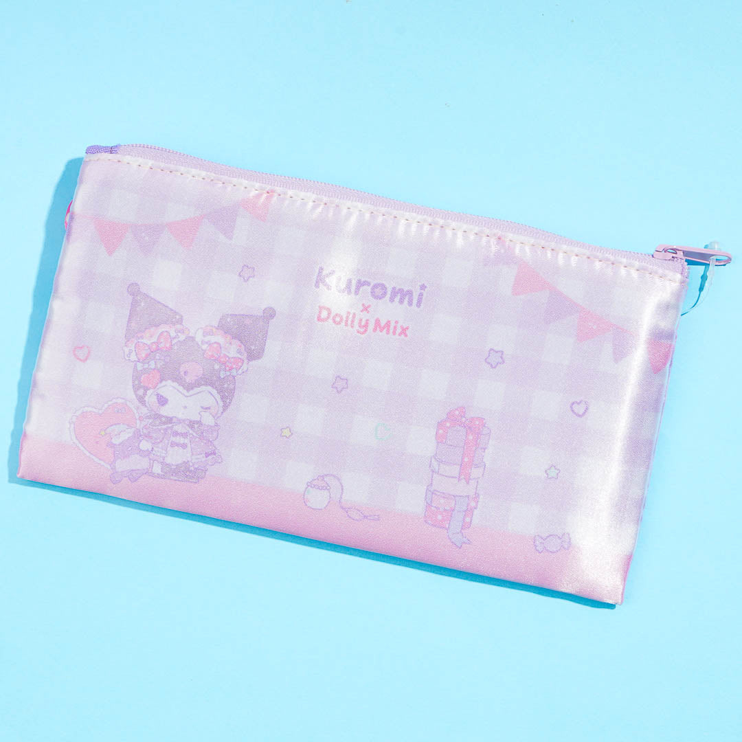 Store your cute trinkets like bracelets and charms in this soft flat pouch! It features a shimmery design with kawaii illustrations of Kuromi dressed as a doll.