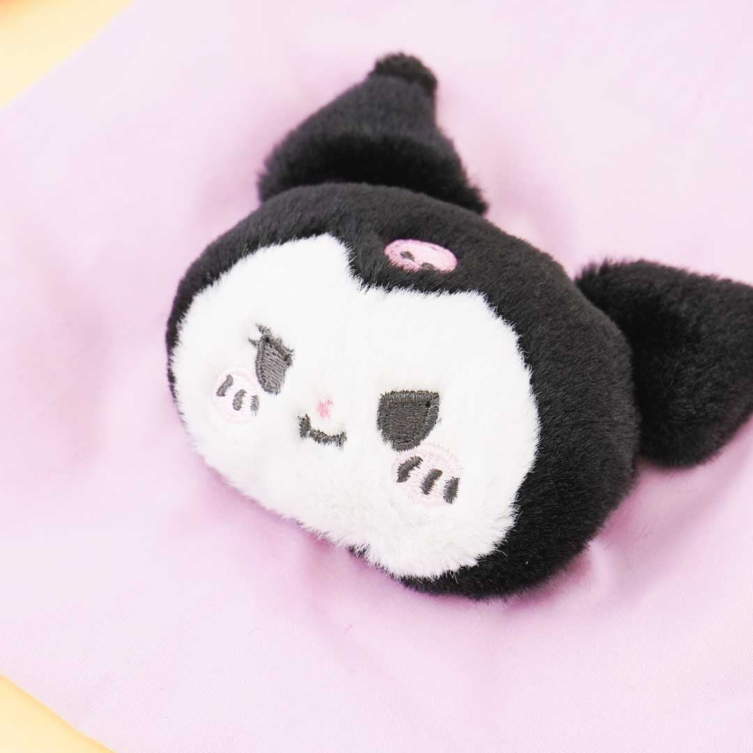 A kawaii drawstring pouch with a fluffy Kuromi face decor and a die-cut Baku tag