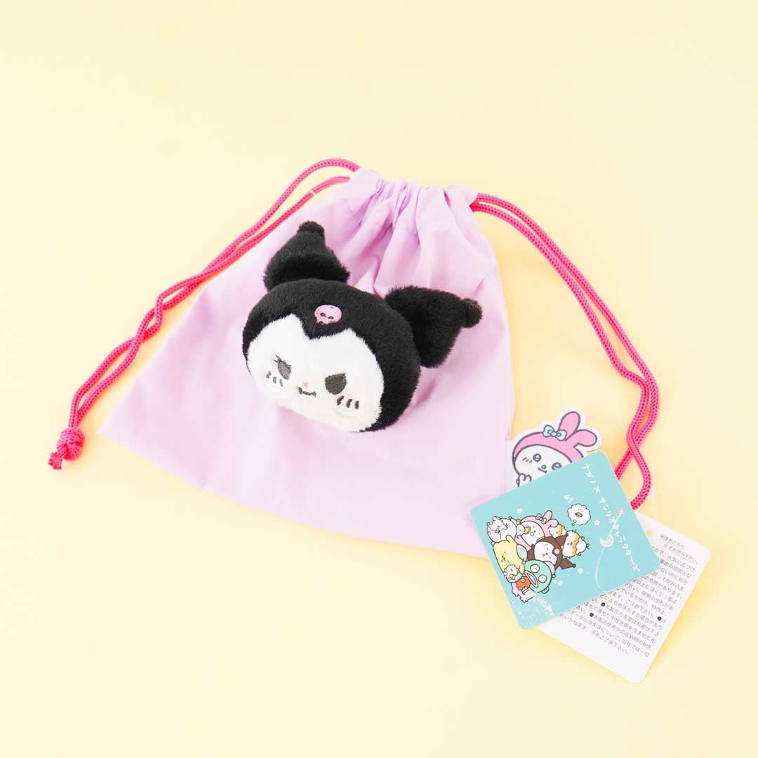 This cute drawstring pouch features a fluffy Kuromi face decor and a die-cut Baku tag. It comes from a collaboration between Sanrio and the popular artist Nagano. Use the pouch to store your cosmetics. You can close the pouch just by pulling the strings.