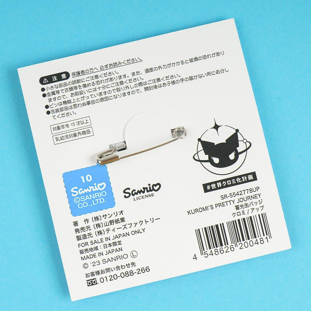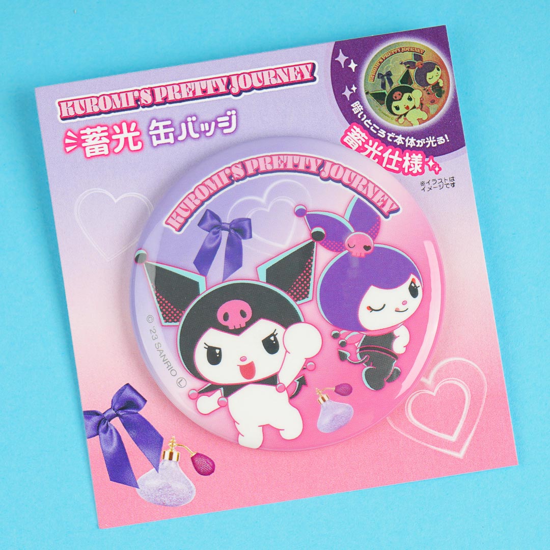 Brighten up your favorite bag with this glow-in-the-dark can badge! It showcases a cute illustration of Kuromi transforming her look. This design is part of Kuromi's Pretty Journey Series.