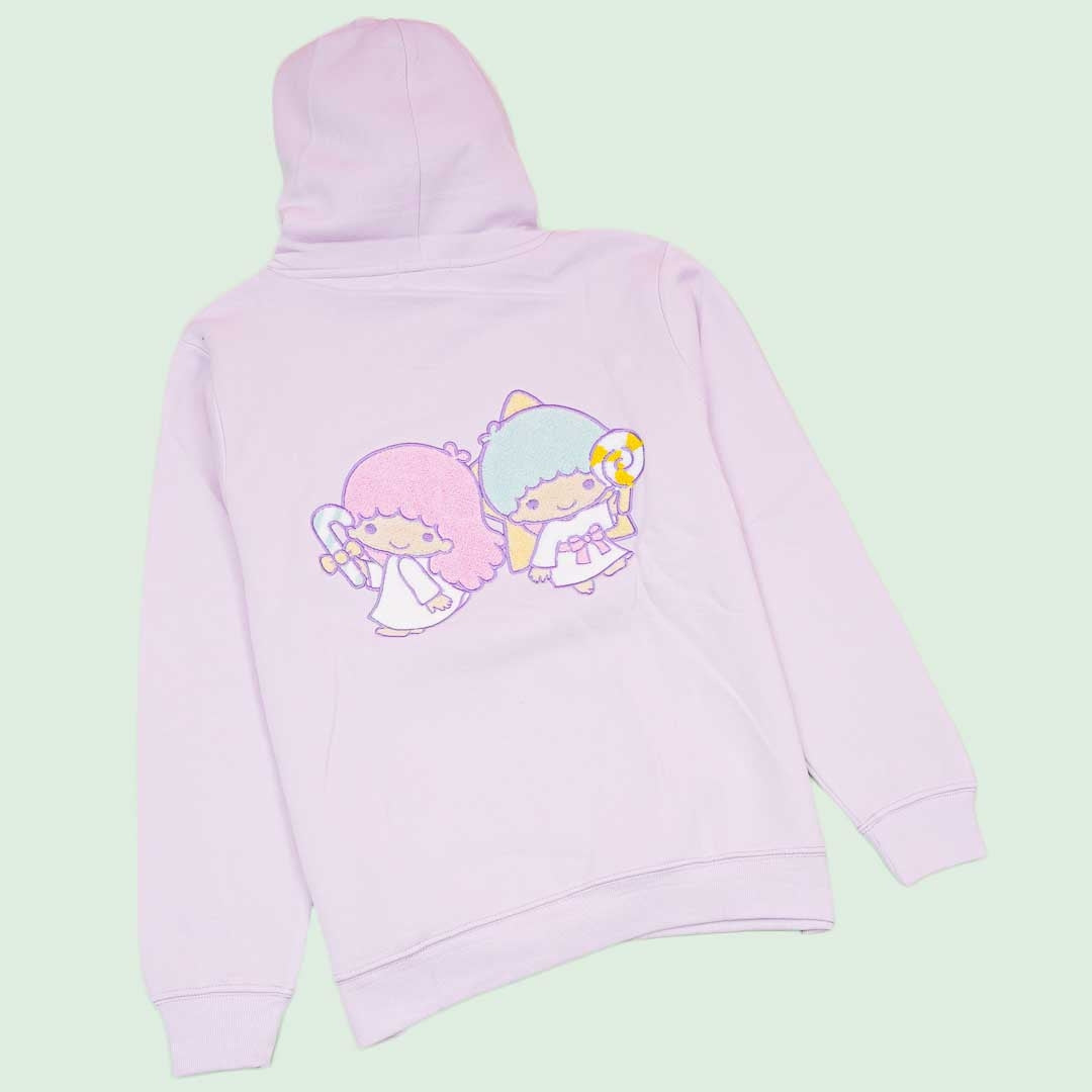 A super cute lavender hoodie with an illustration of the Little Twin Stars