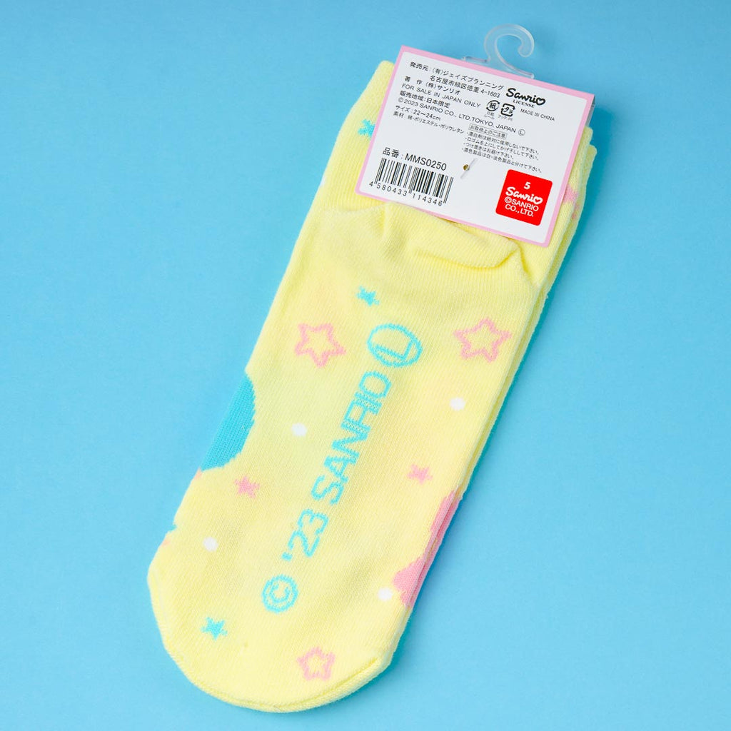 Stay at home and watch your favorite anime series with this pair of cute socks! It features a kawaii print of Little Twin Stars with a starry background and a bowtie on top.