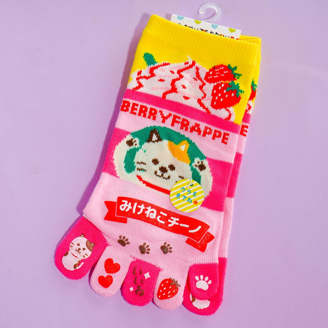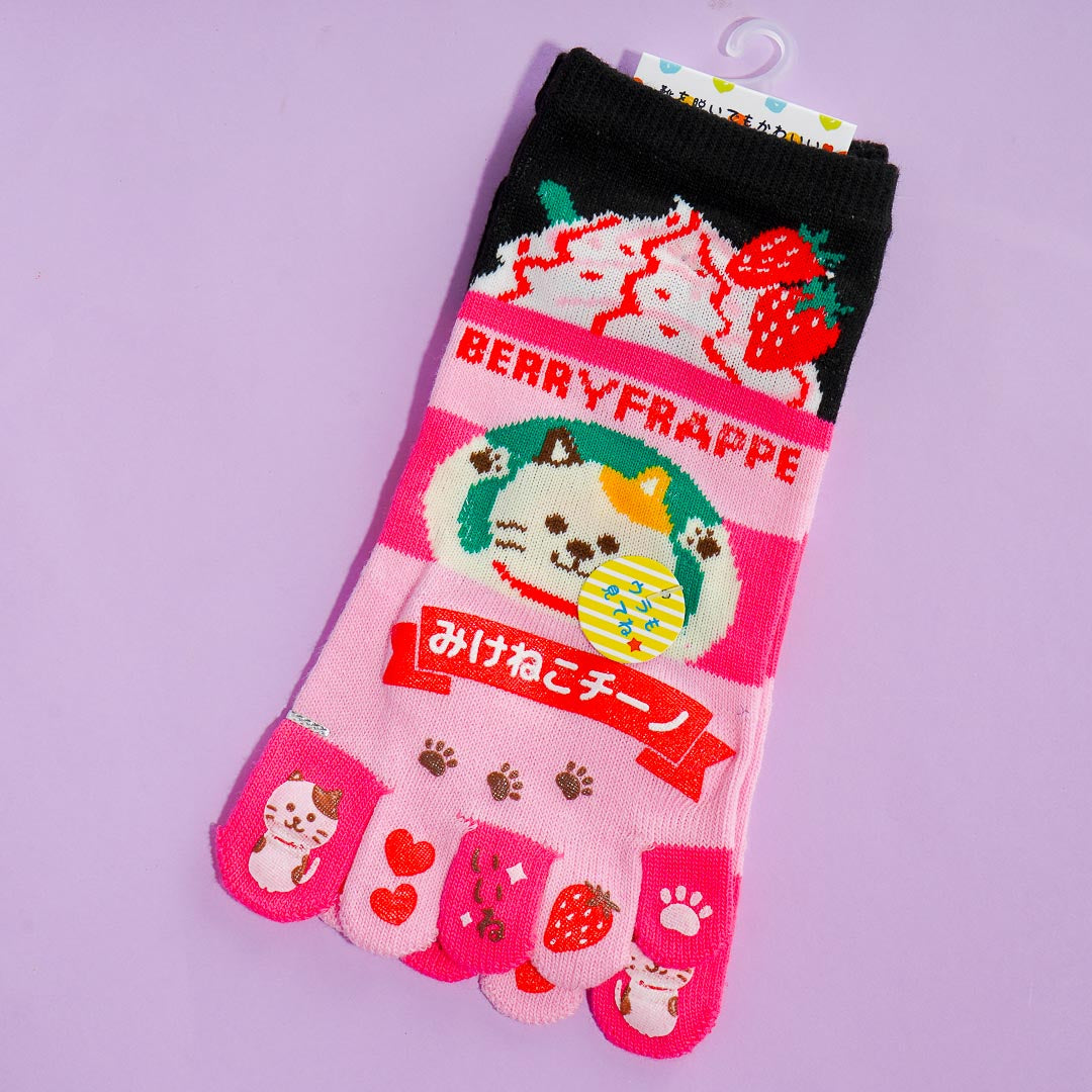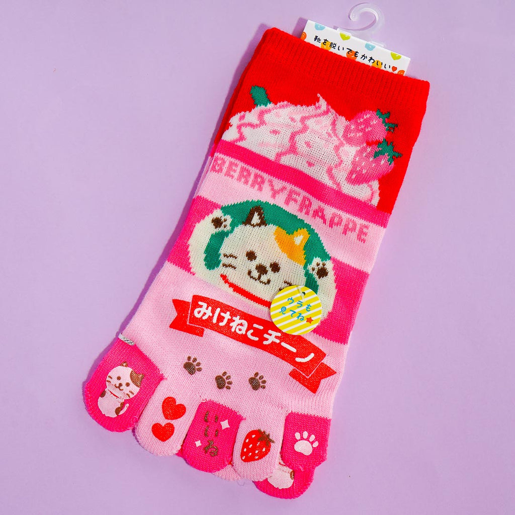 This kawaii pair of ankle-length toe socks showcases a print of a strawberry frappe with a cute cat! It's perfect to wear while lounging around the house. Each toe tip has a cute little print.