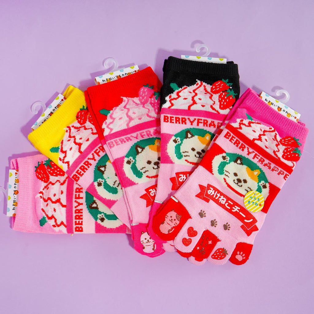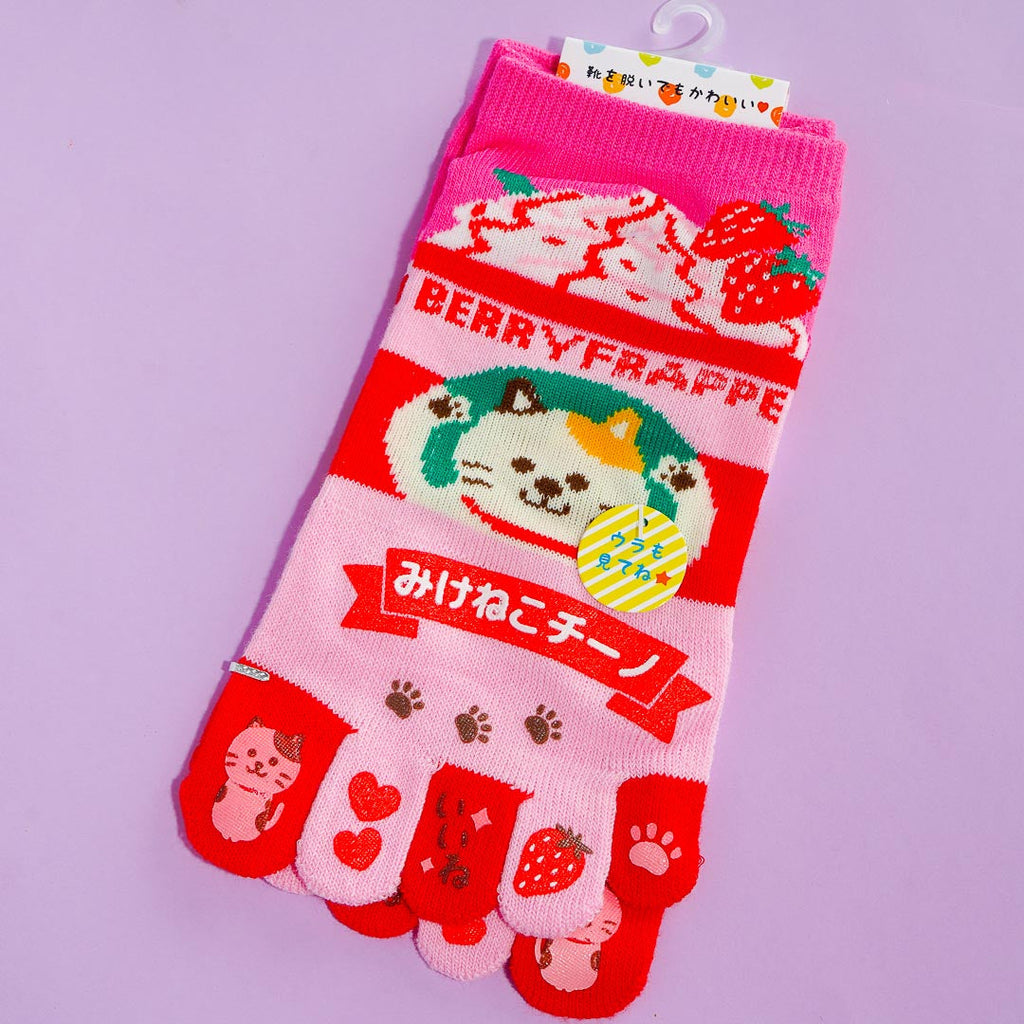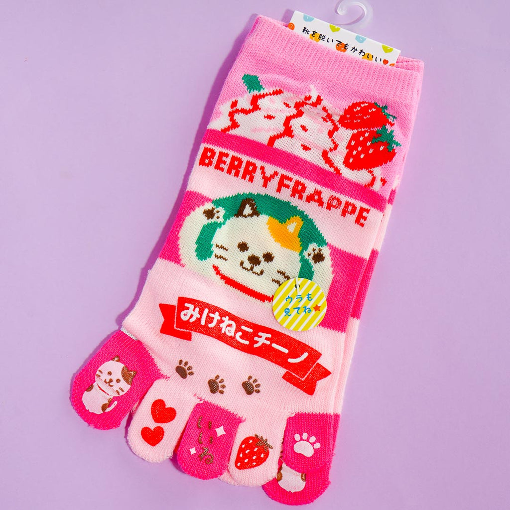 This kawaii pair of ankle-length toe socks showcases a print of a strawberry frappe with a cute cat! It's perfect to wear while lounging around the house. Each toe tip has a cute little print.