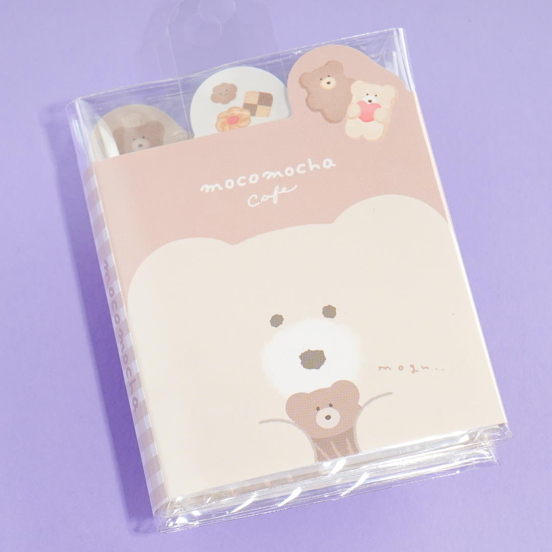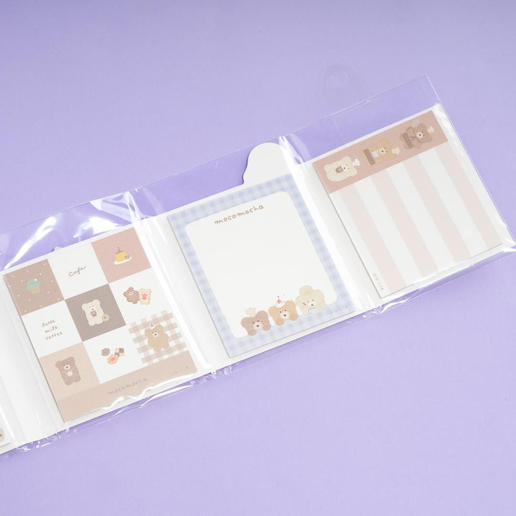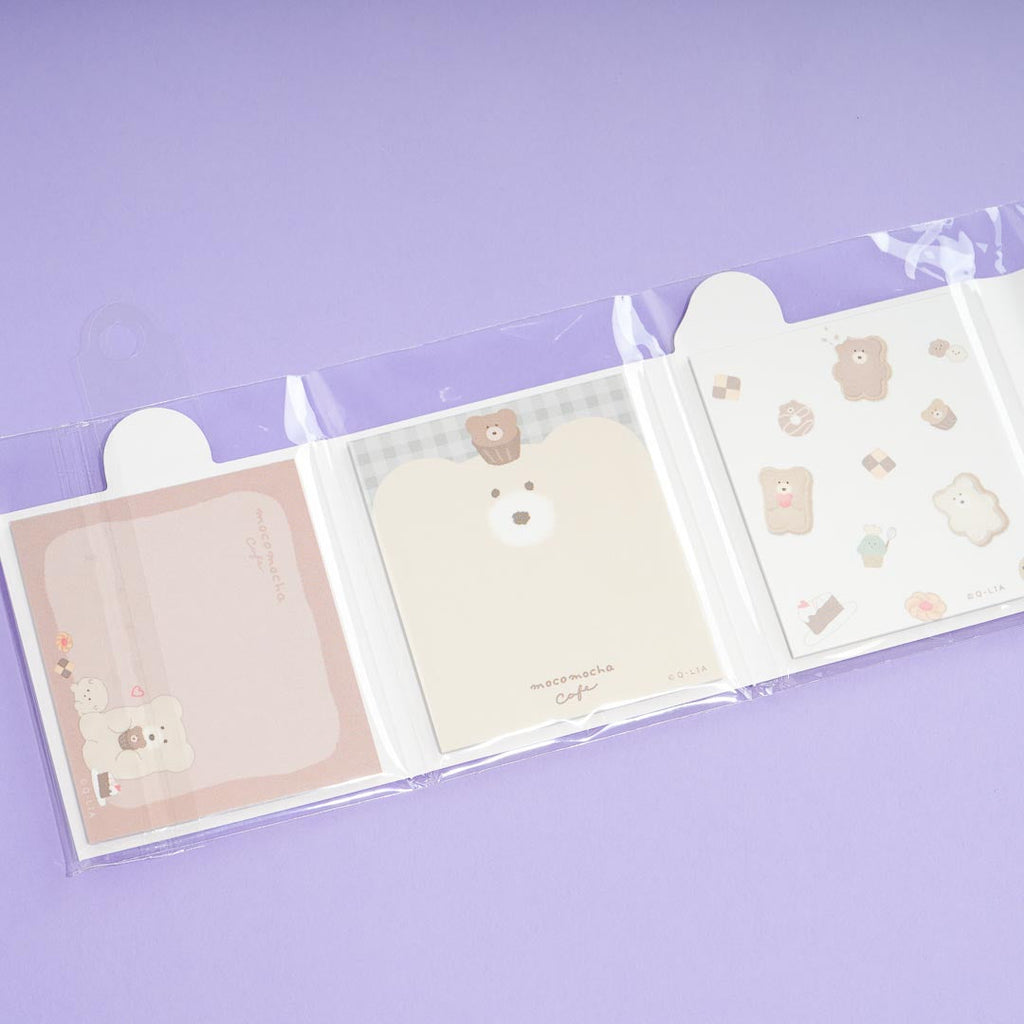 Use this kawaii memo pad to write short messages on! This mini memo has a book-style cover that can be unfolded to reveal six various sheet designs decorated with illustrations of bears and pastries!