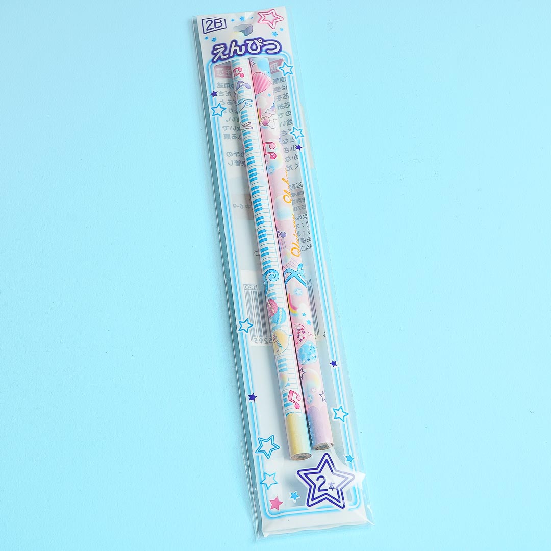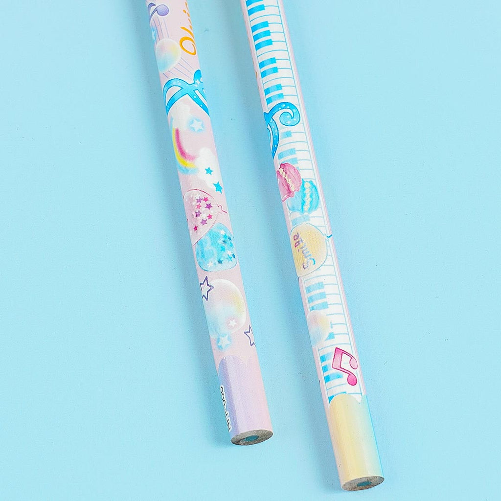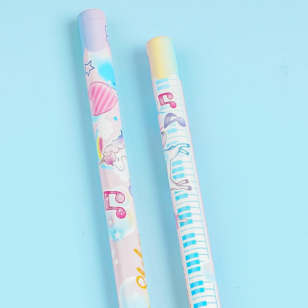 These kawaii 2B pencils are perfect for writing short stories! It's illustrated with musical notes and unicorns. This set features a pink background with blue and yellow details.