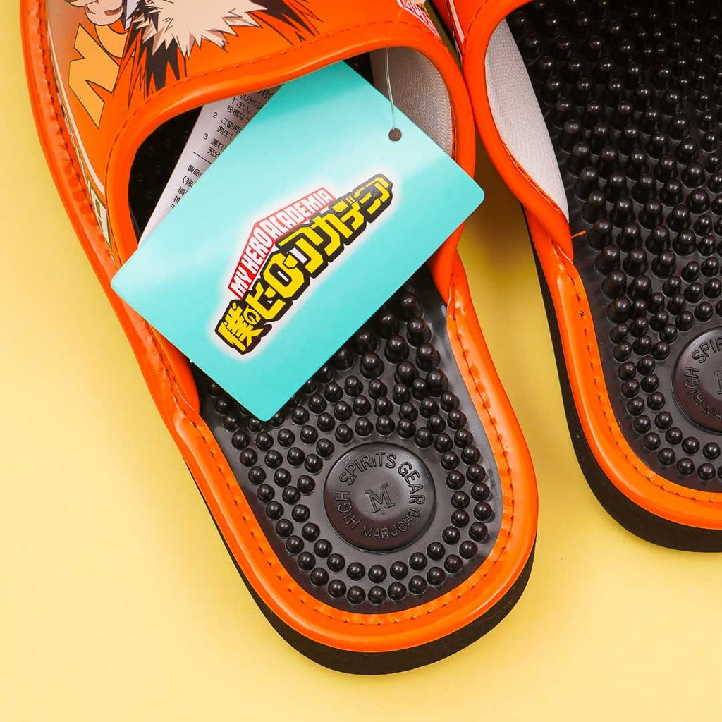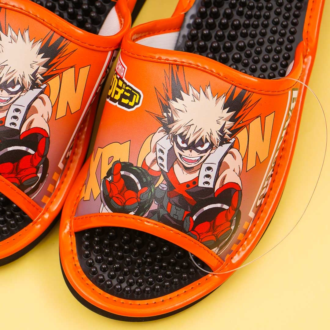 A orange pair of medium acupressure slippers featuring Katsuki Bakugo of My Hero Academia