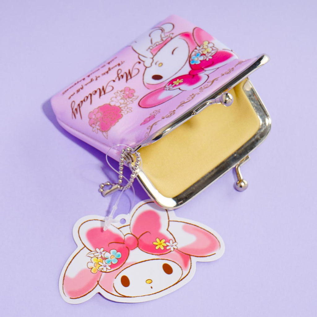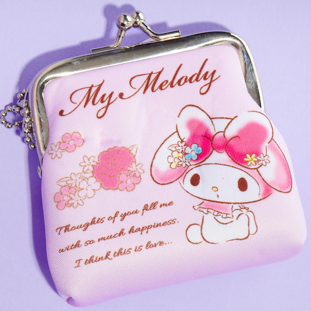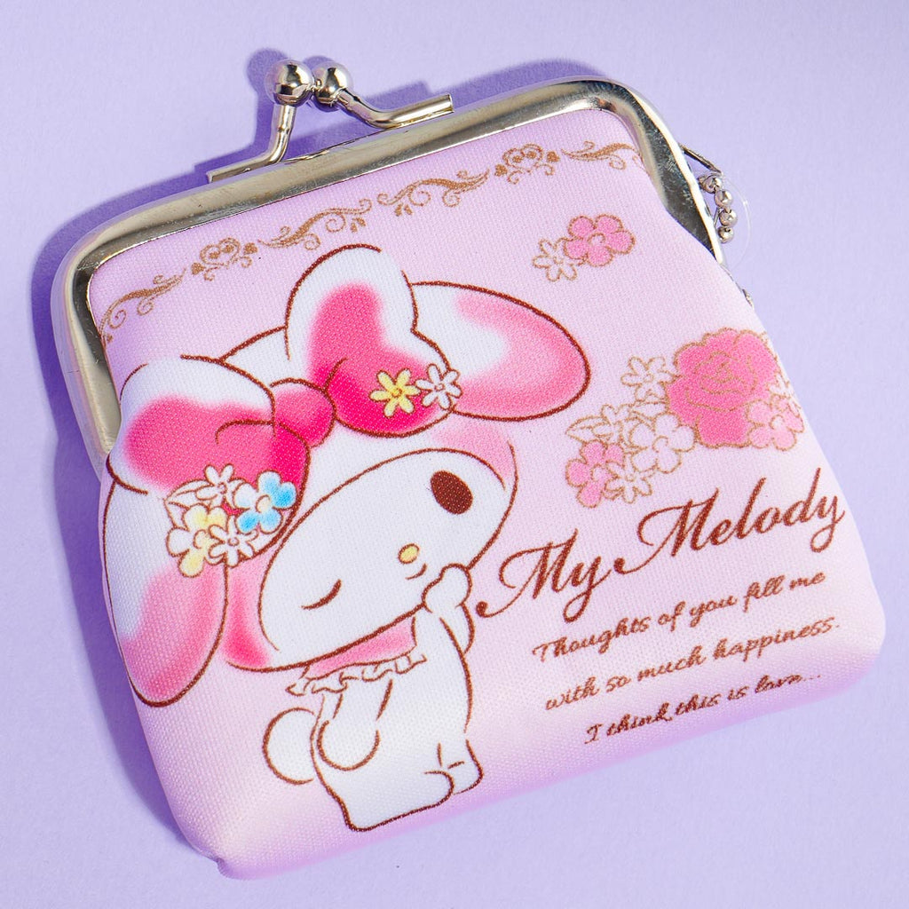 This super cute pink purse has a vintage-inspired print of My Melody doing an air kiss! Keep your coins and cash safe inside as it also comes with a convenient clasp closure.