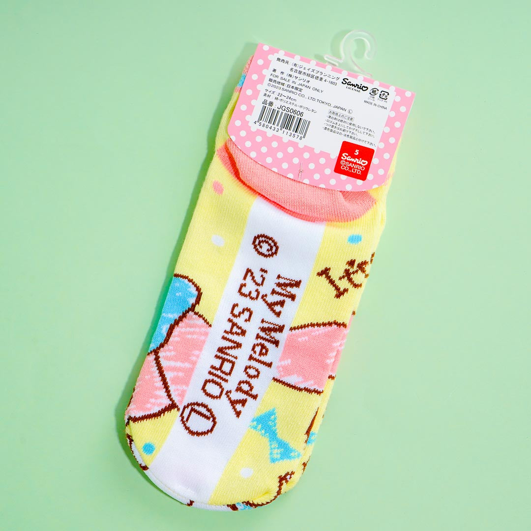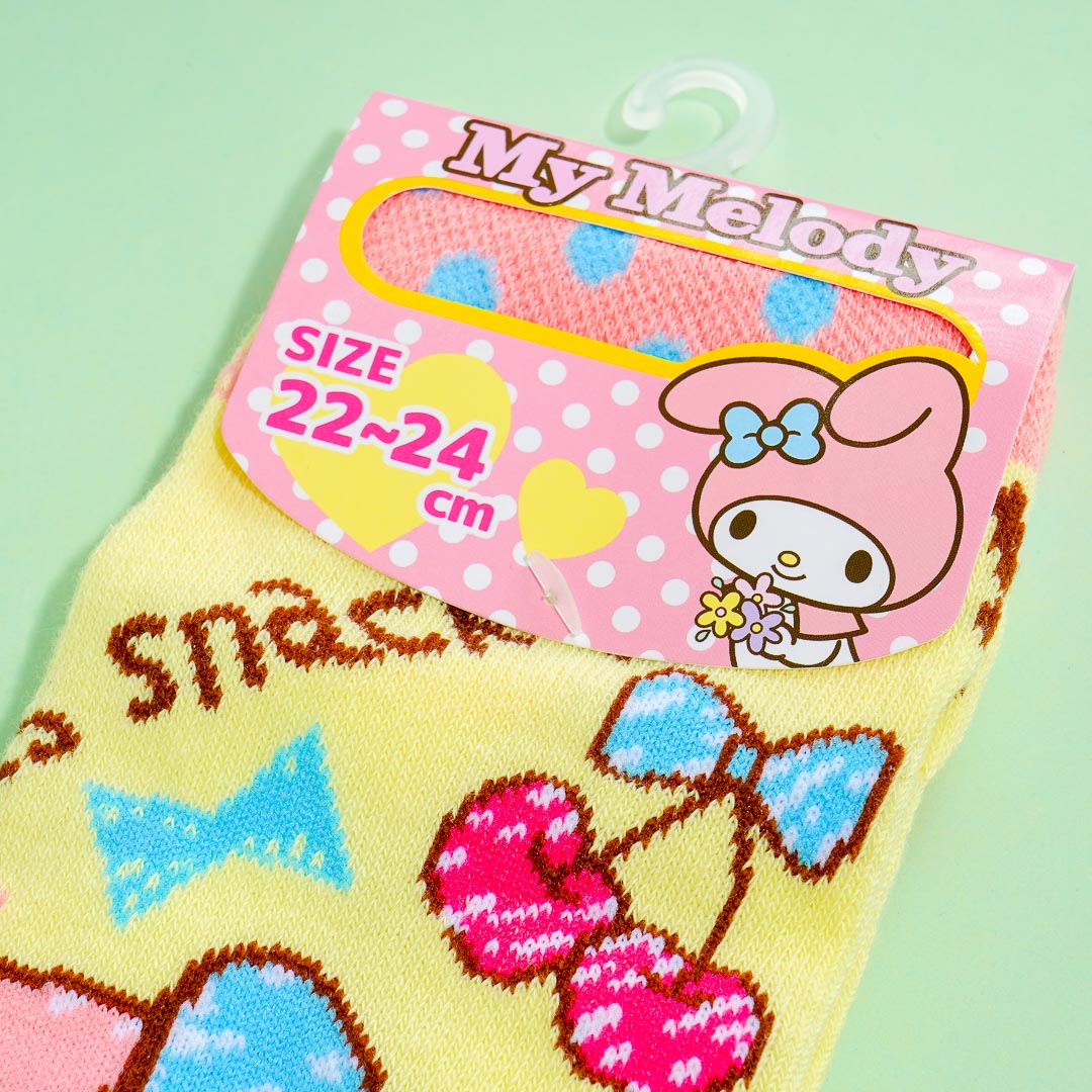 Complete your super cute outfit by wearing this pair of pink jacquard socks! These are decorated with kawaii colorful prints of My Melody having her favorite dessert crepe.
