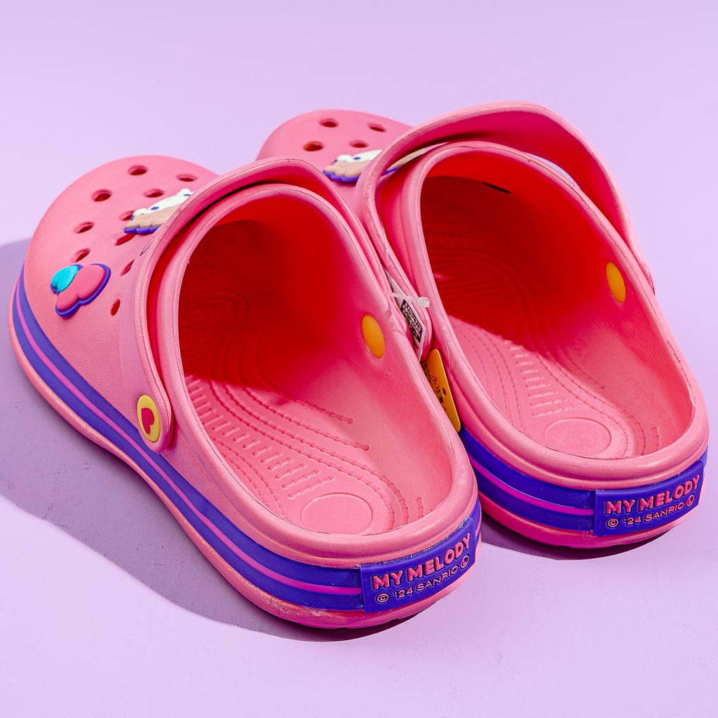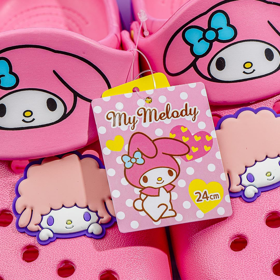 This super kawaii pair of large-sized sandals has illustrations of My Melody and cute rubber charms of hearts and My Sweet Piano! Wear this comfy pair while lounging around the house. The pink slippers are made from EVA — a special rubber-like resin material.