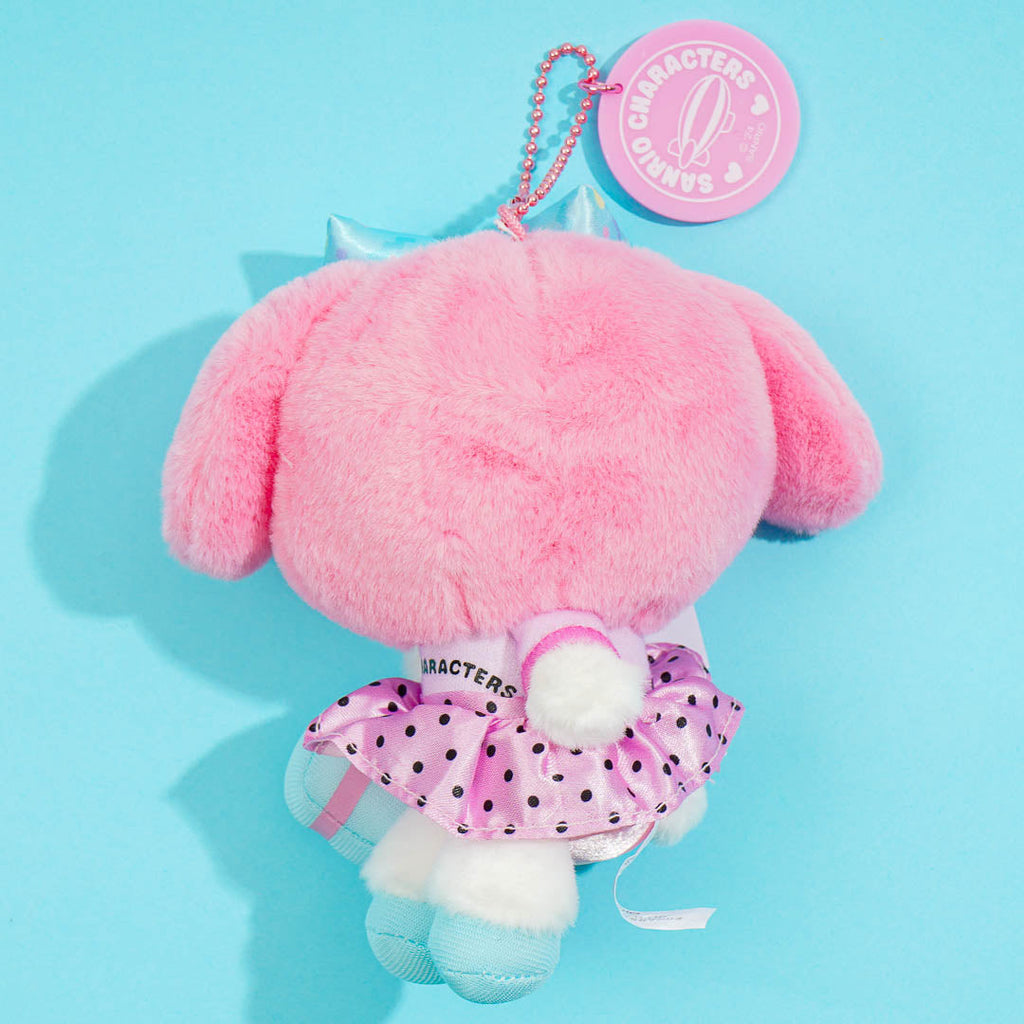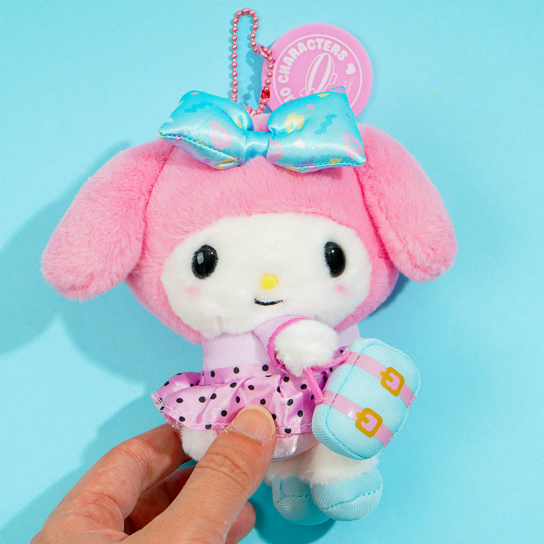 This My Melody plushie is perfect for your kawaii collection! It's wearing a polka dot dress and a big ribbon. My Melody is also holding a travel bag for her trip! This small plushie also comes with a cute round charm and a ball chain so you can easily hang it on your favorite bag.