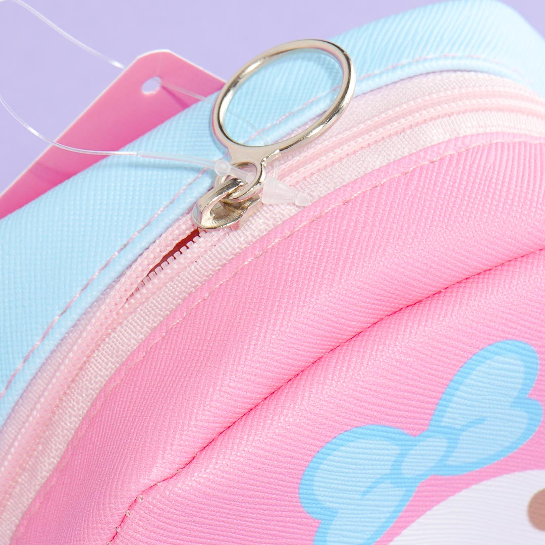 Use this super cute pouch to store your favorite rings and charm bracelets when you travel! It has a special double-sided design featuring the faces of My Melody and her mouse friend, Flat! This case comes with pop-out ears and a zipper closure.