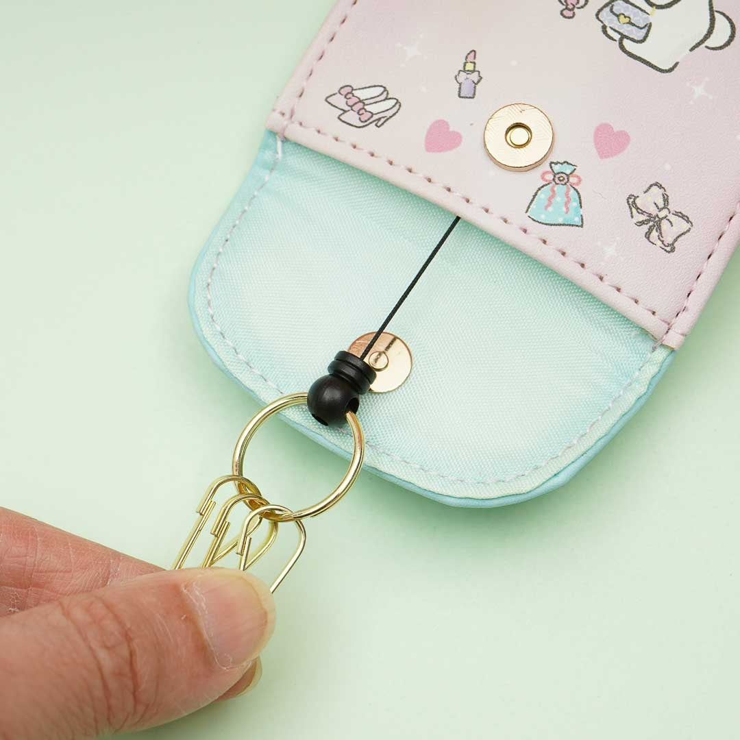 This cute key case is decorated with prints of My Melody and hearts. It has multiple metal clips for your keys, an extendable reel cord, and a metal hook so you can attach the case to your bag. Use it to keep your keys organized!