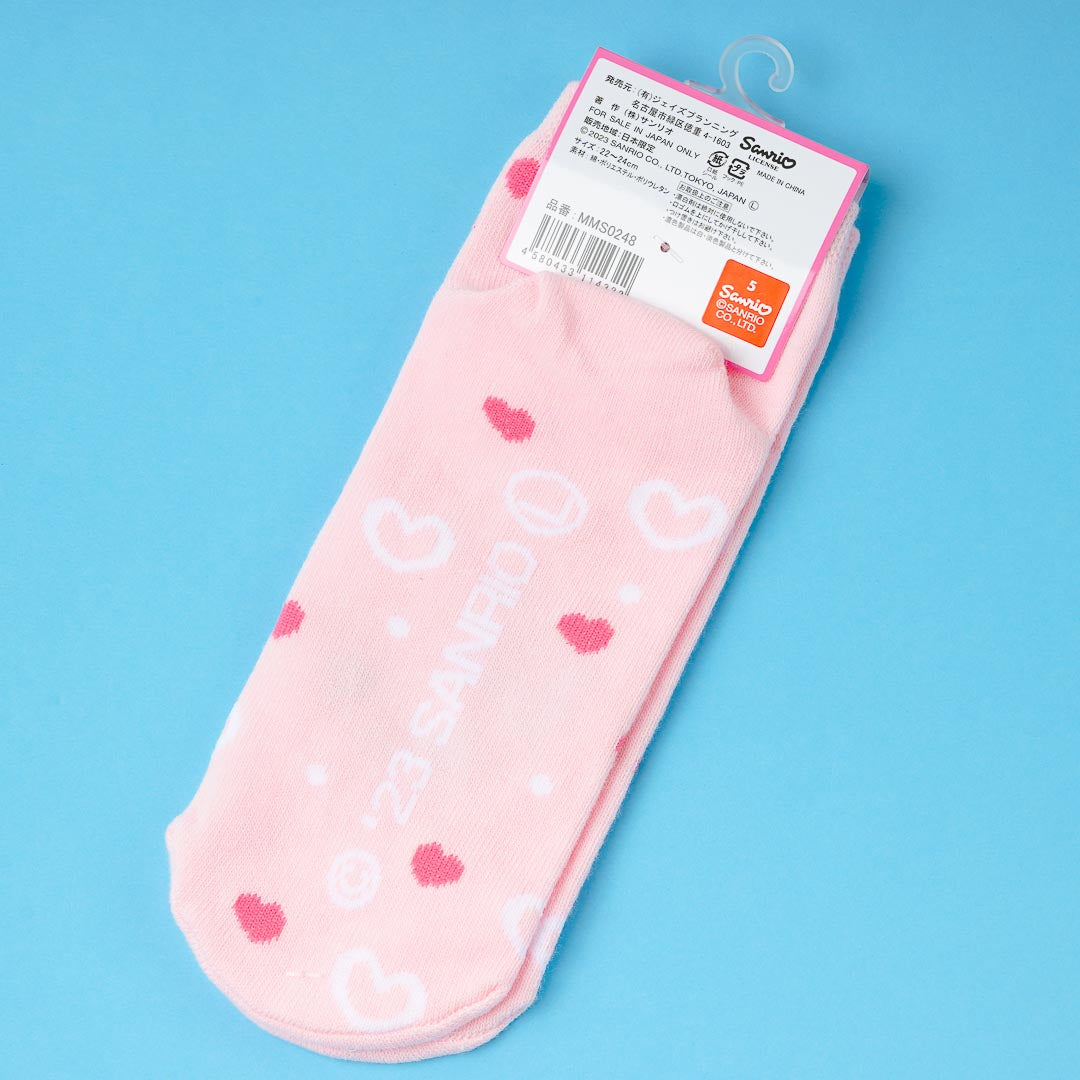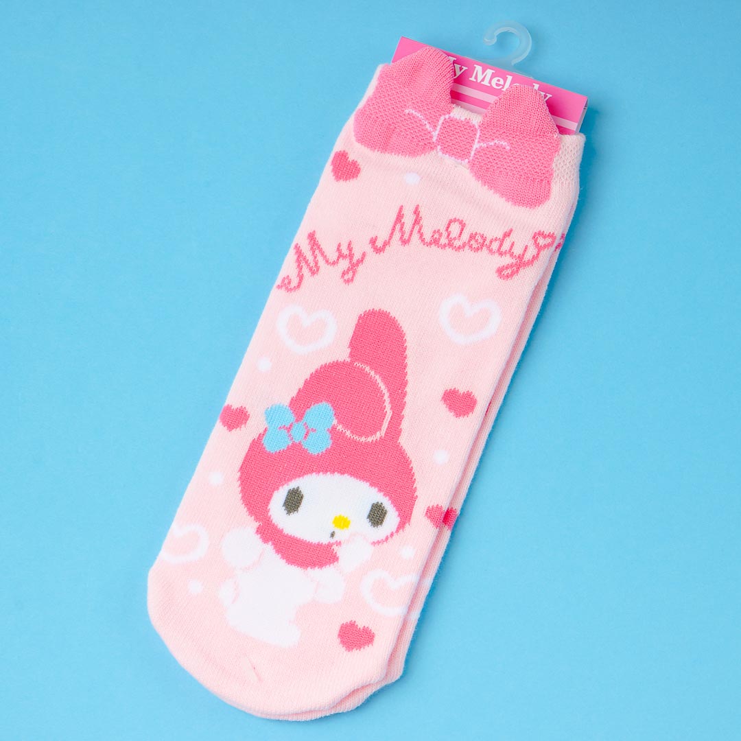 Wear a cozy outfit with this pair of kawaii socks! It features a cute print of My Melody with a background full of hearts and a bowtie on top.