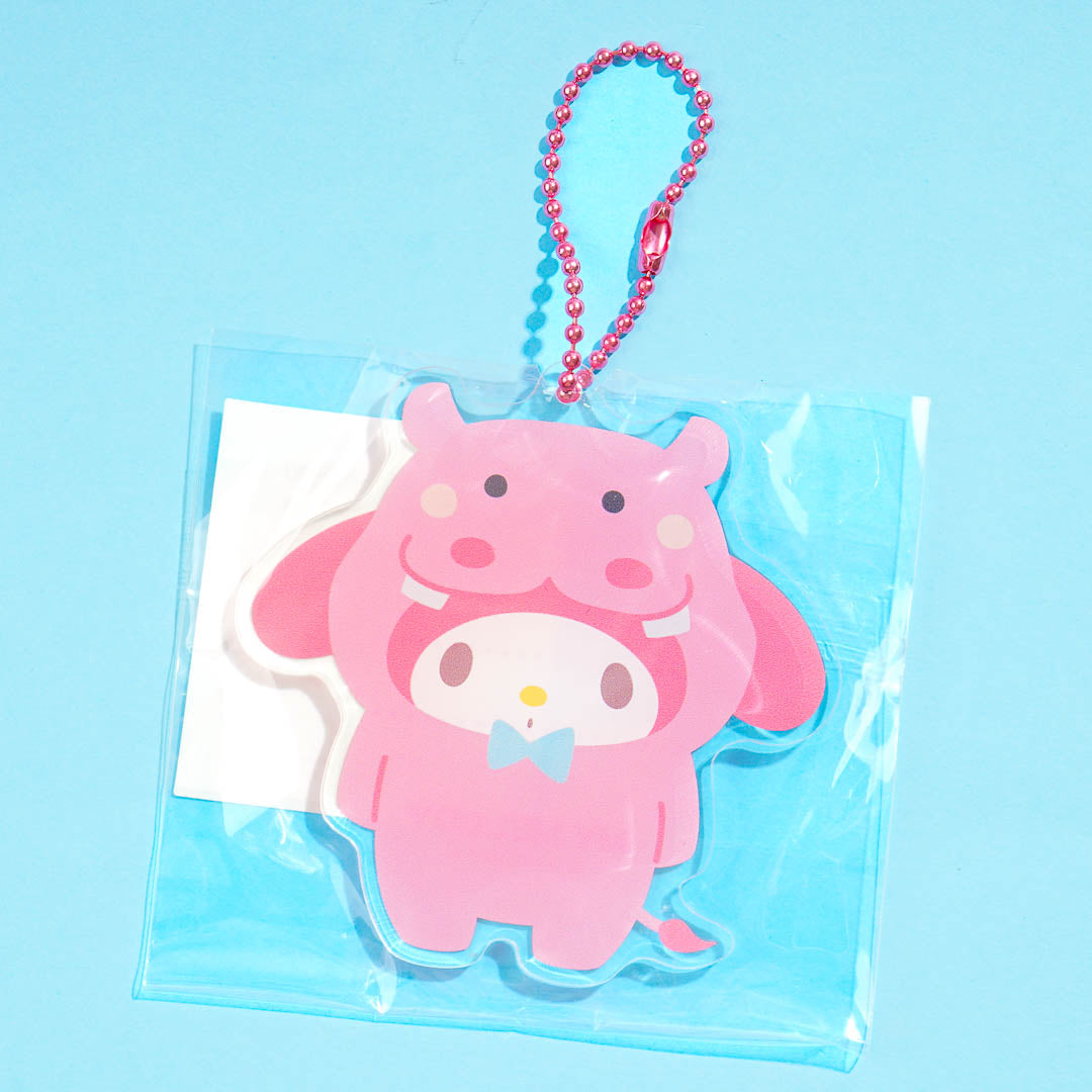 Attach this super cute acrylic charm to your backpack using its removable ball chain! It showcases a die-cut design of My Melody wearing a hippo onesie.