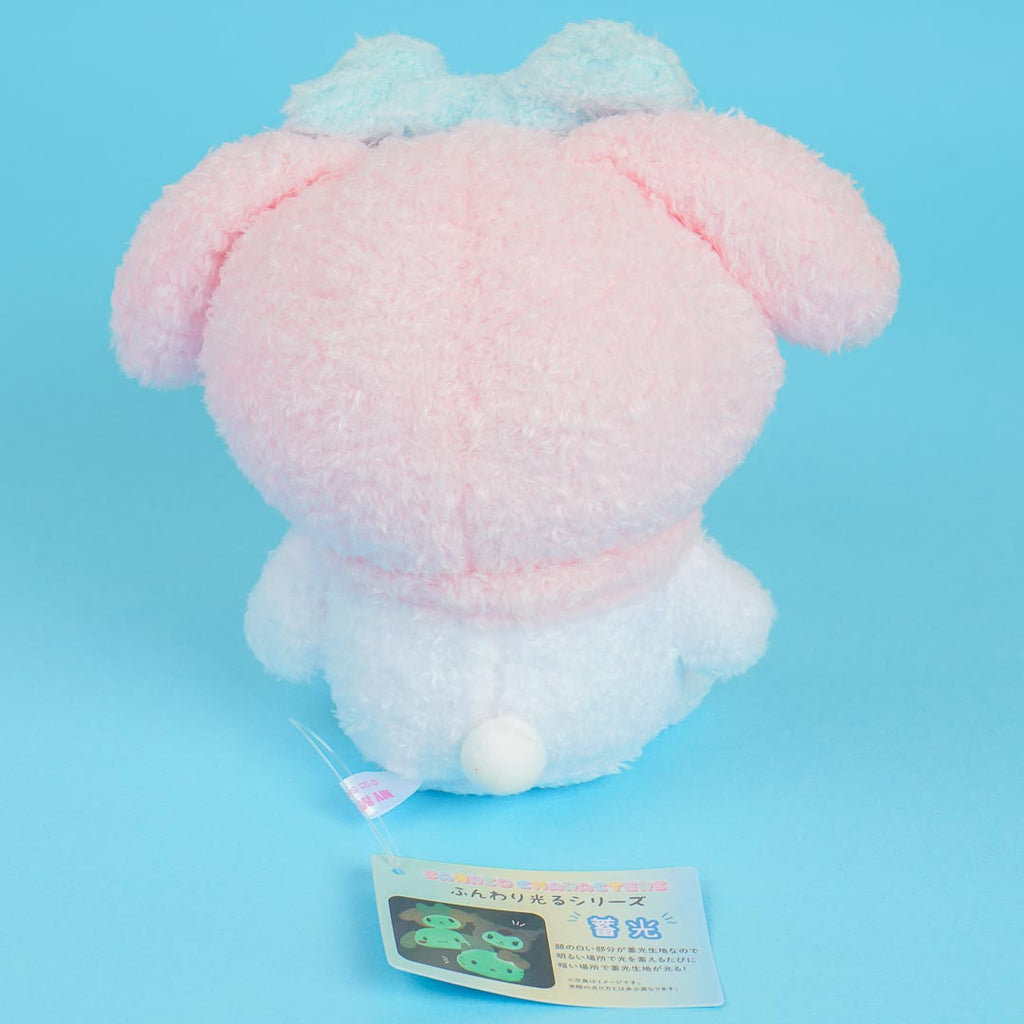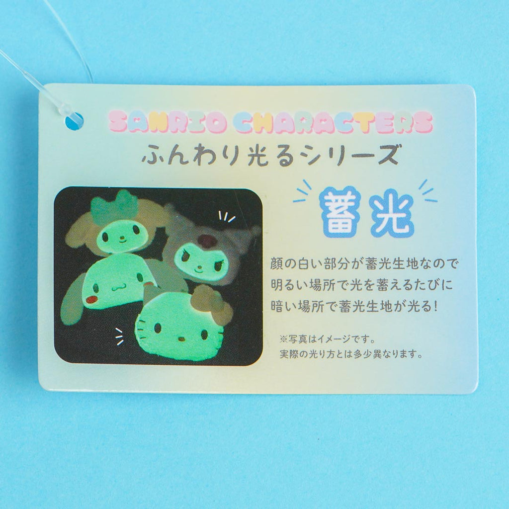 This kawaii My Melody plushie is made from fabric that glows! It comes from the Sanrio Fluffy Luminous series. Place this palm-sized plushie underneath some bright light and watch it glow when you bring it into the dark.