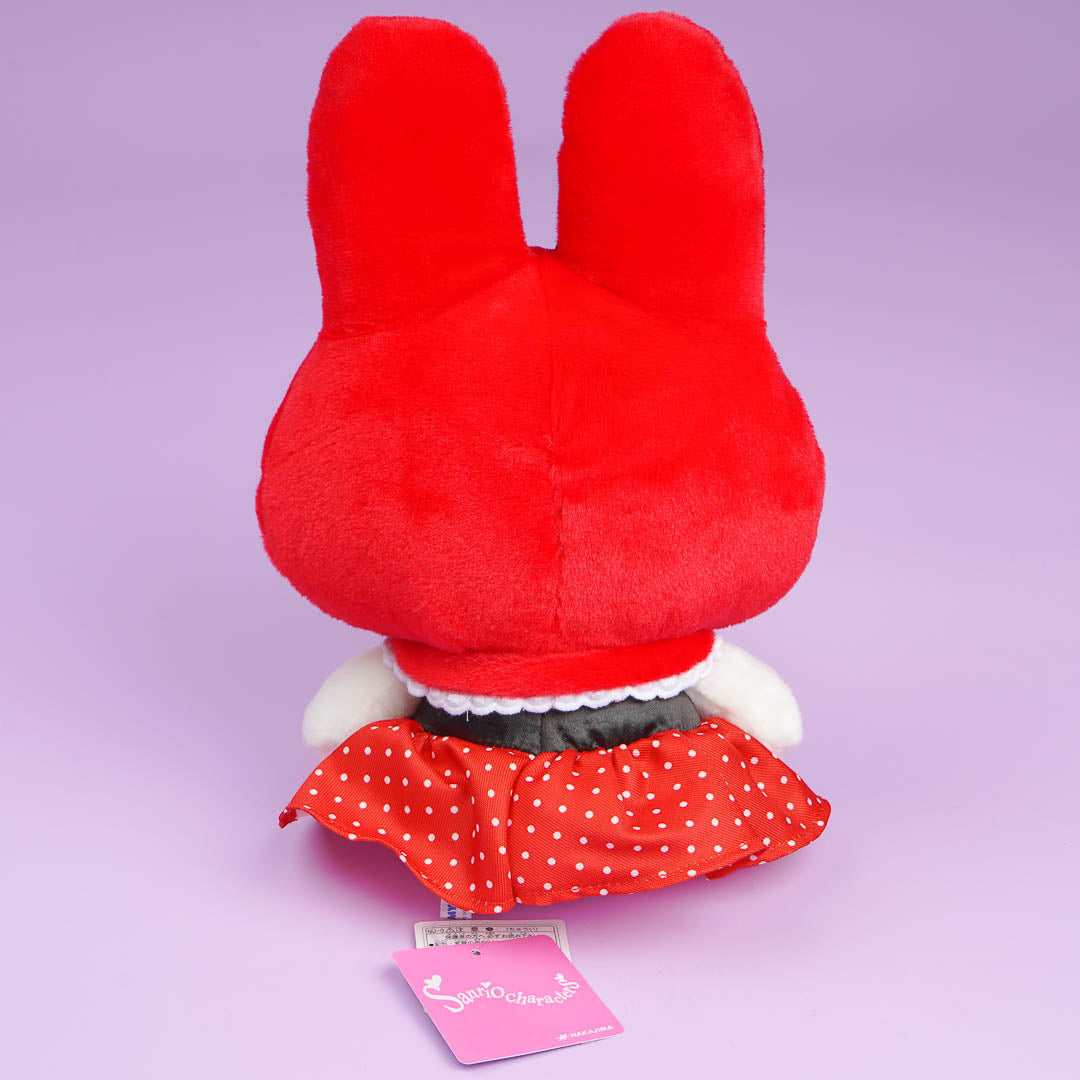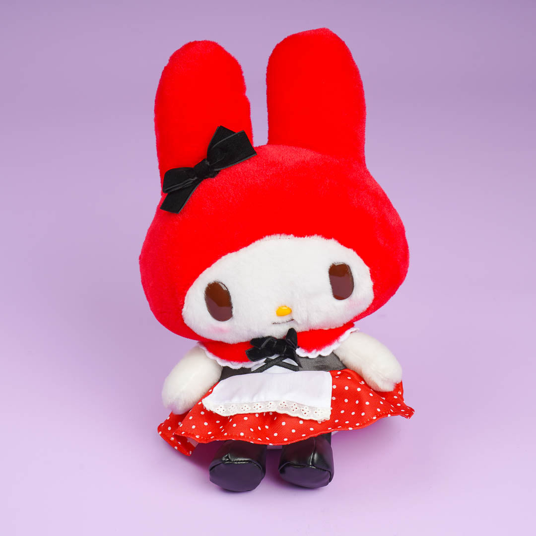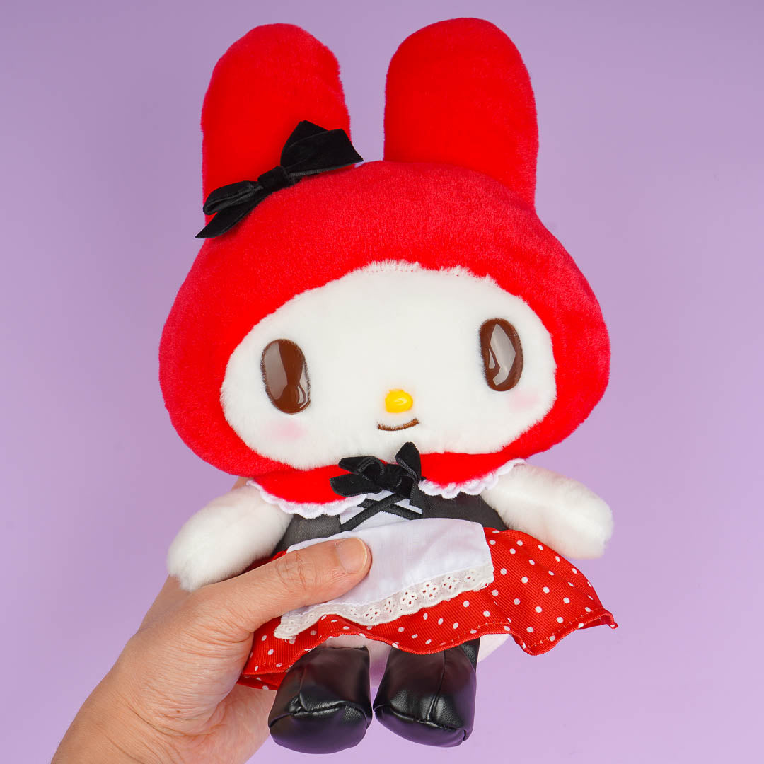 Cuddle with this kawaii medium-sized plushie! My Melody is wearing a retro outfit that resembles Little Red Riding Hood. It features a black ribbon, leather boots, and shiny plastic eyes.
