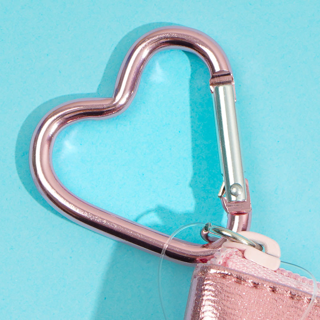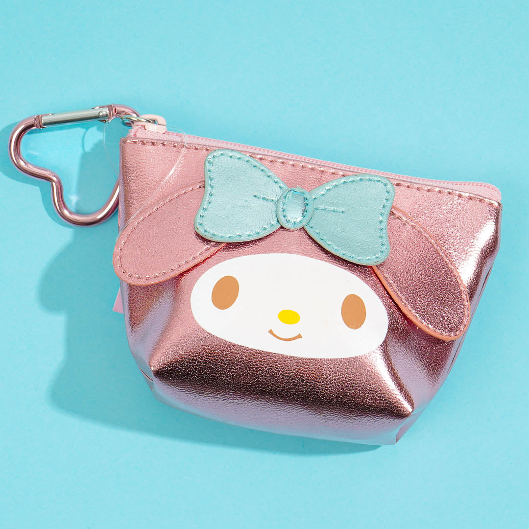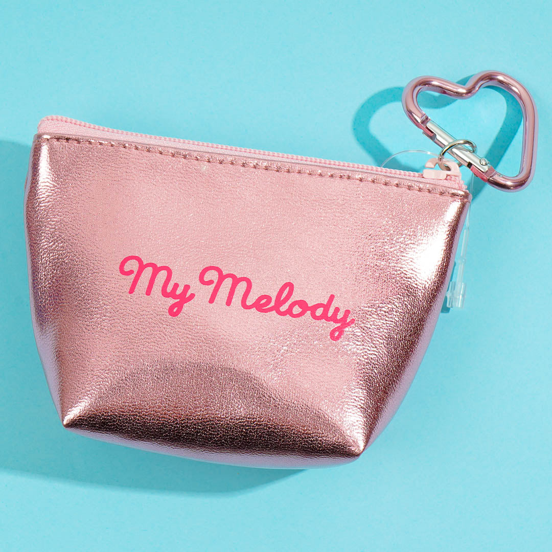 Use this super kawaii My Melody pouch to bring your trinkets! It's made of material with a shiny metallic sheen. This zippered pouch comes with a heart-shaped metal clip.