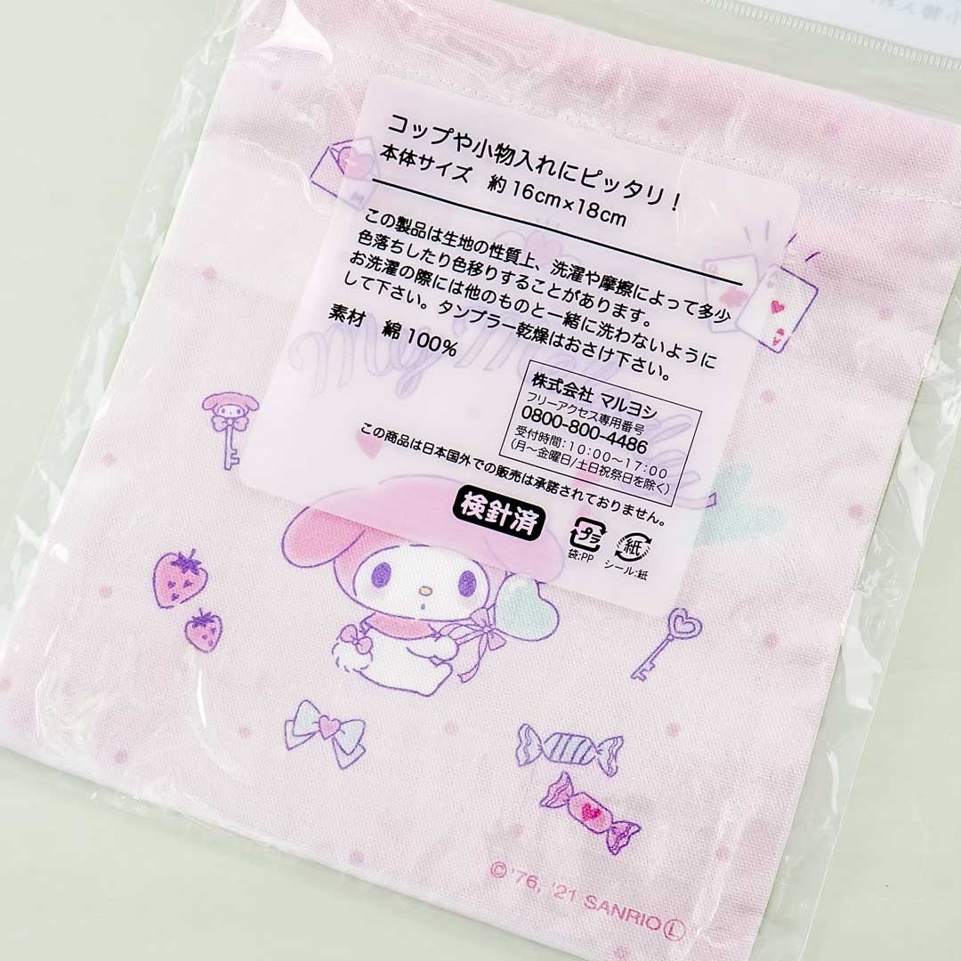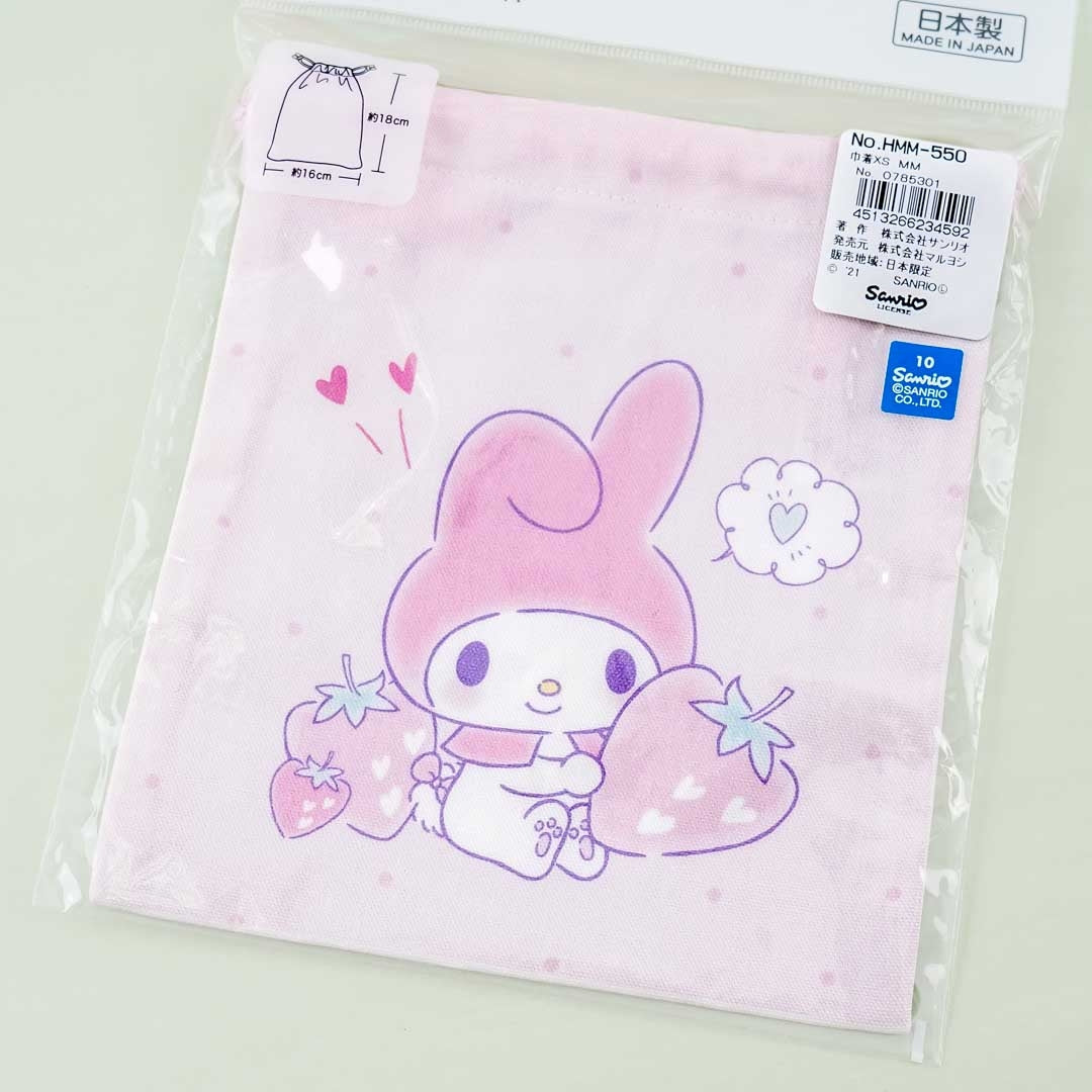 Use this cute drawstring pouch to store your bracelets, charms, and other trinkets. It features a print of My Melody playing with strawberries with hearts on them. Just pull on the strings of this cotton pouch to keep it closed!