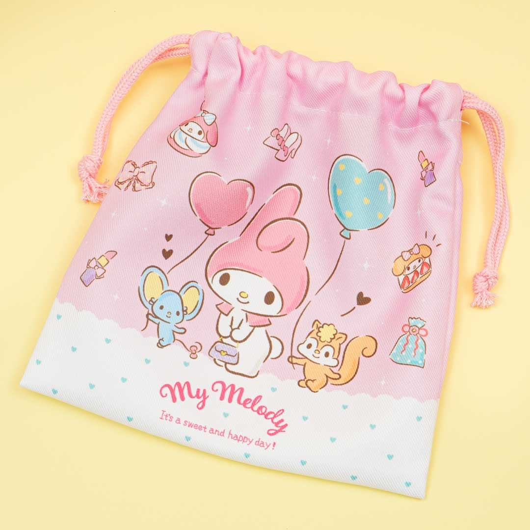 A kawaii drawstring pouch with prints of My Melody having a party with friends and desserts