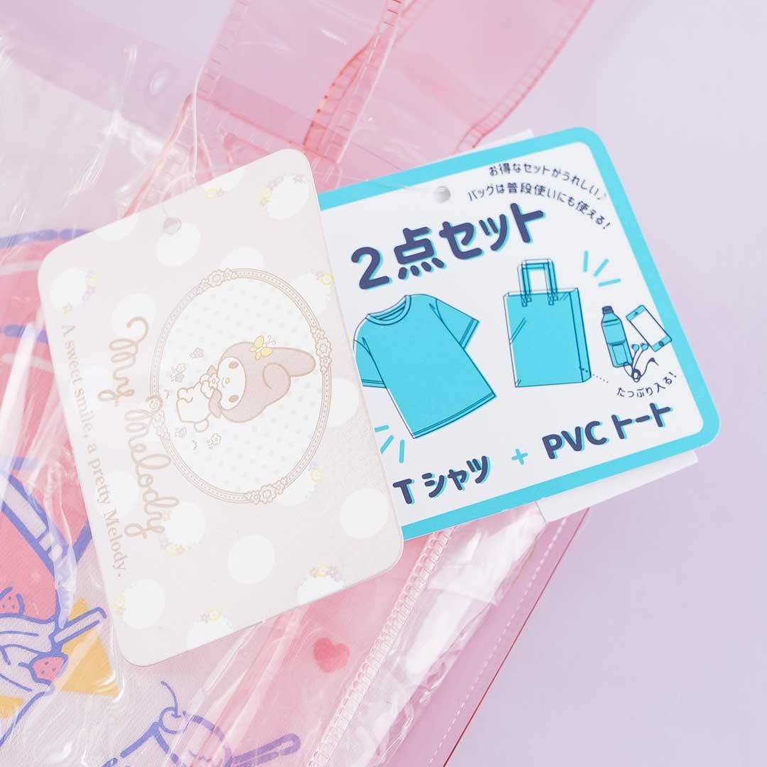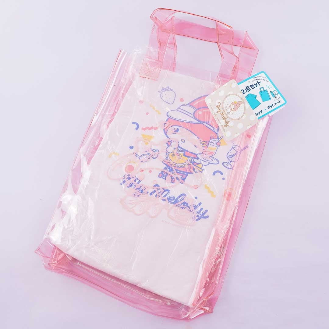 A super cute t-shirt and bag set featuring prints of My Melody with sweet drinks and a telephone