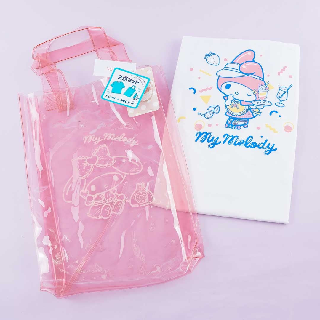 Dress up in kawaii fashion by adding this shirt and bag set to your outfit of the day. The shirt is illustrated with a print of My Melody serving sweet drinks. Bring your essentials inside the bag featuring a print of My Melody with a telephone!