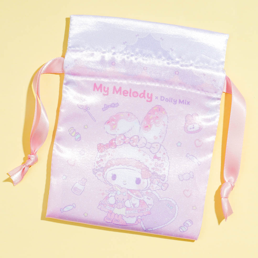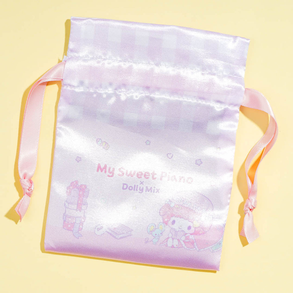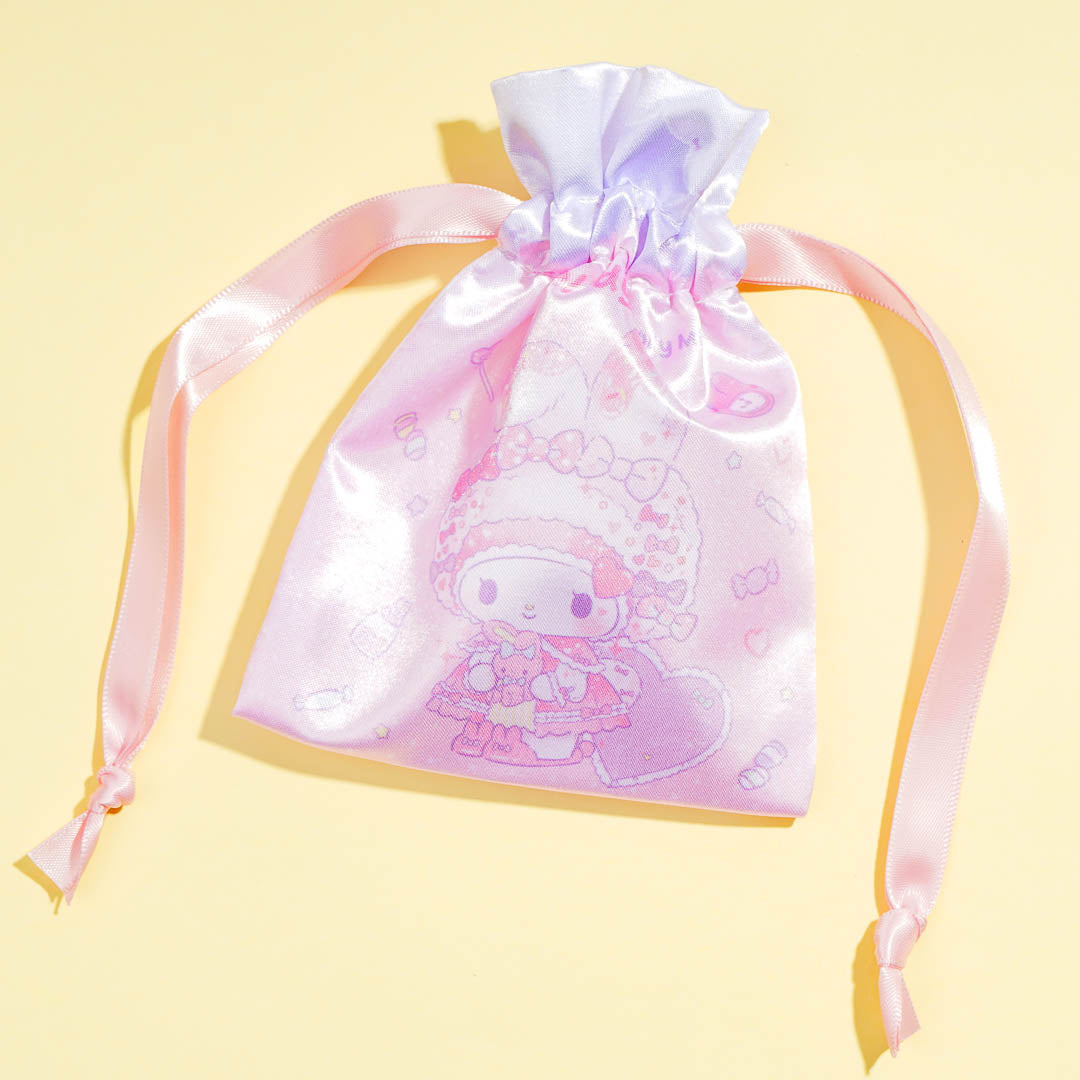 Store your keys, cards, and other small essentials in this super cute mini pouch! It features cute illustrations of My Melody dressed as a Lolita doll. Pull the strings to close this bag that's made from shiny polyester fabric.