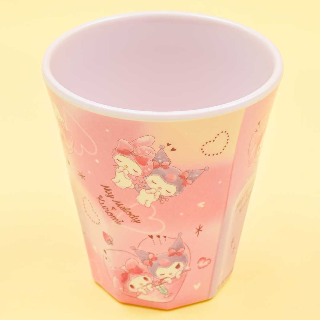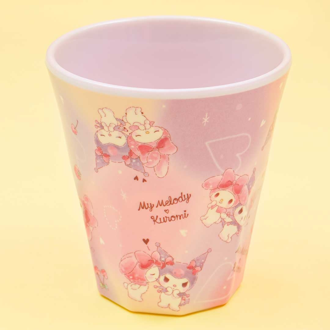 A super cute melamine cup decorated with prints of My Melody and Kuromi having fun