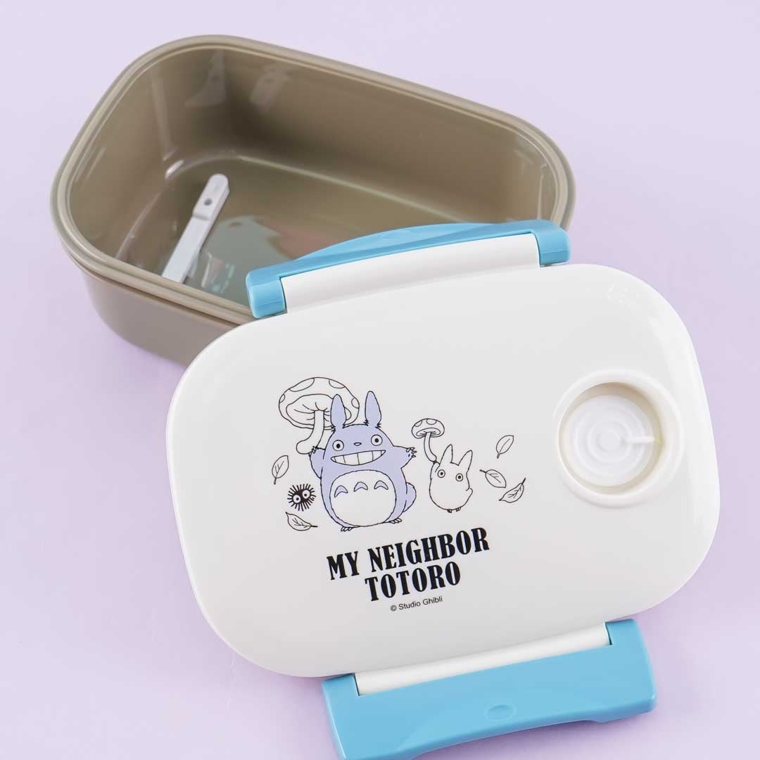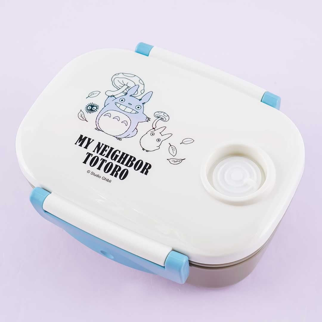 • A vacuum food container with illustrations of Totoro, Chibi-Totoro, and mushrooms