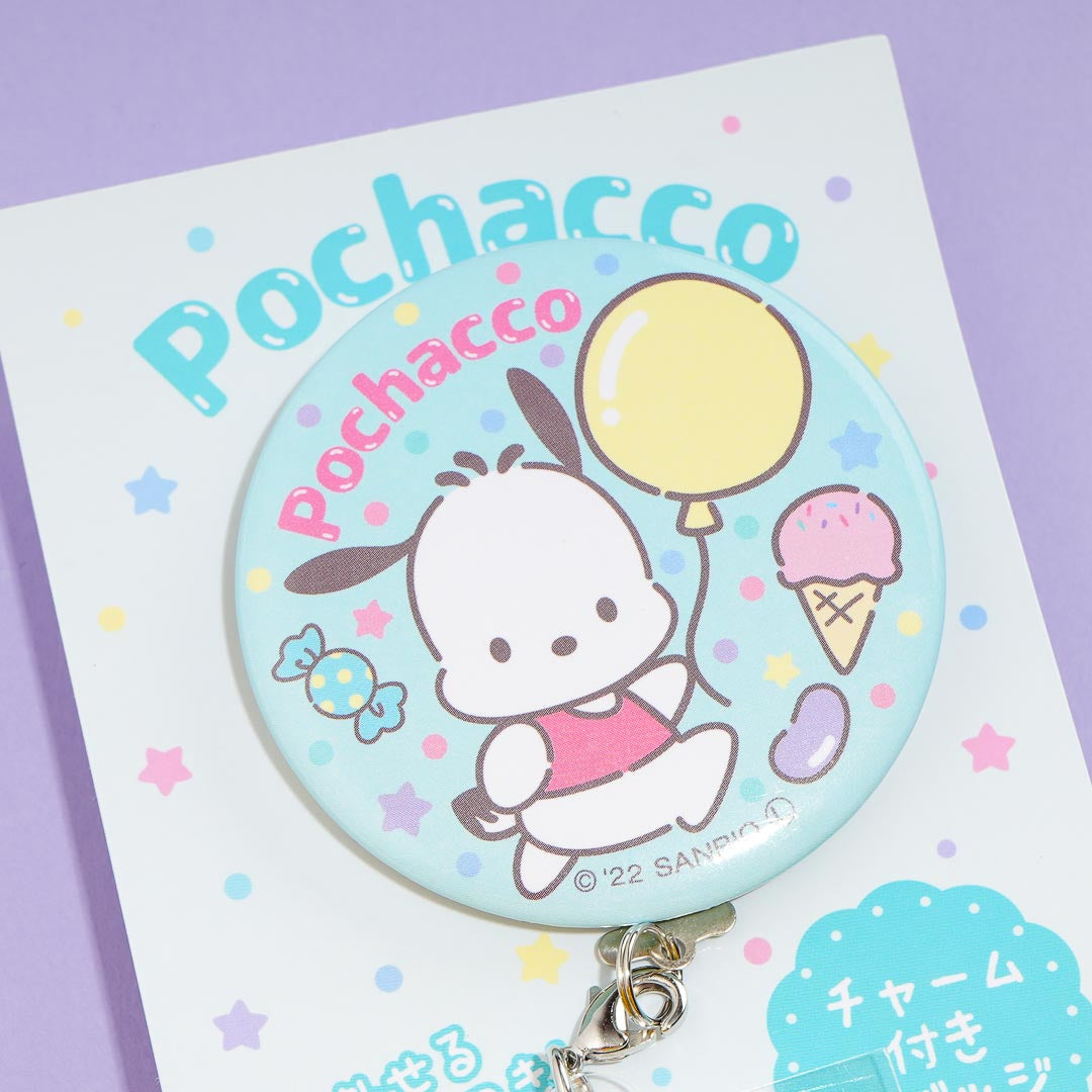Show off your love for Pochacco with this super kawaii badge! It features an illustration of Pochacco holding a balloon with some sweet treats. The badge also comes with a die-cut charm of the Pi-chans on top of an ice cream cone.