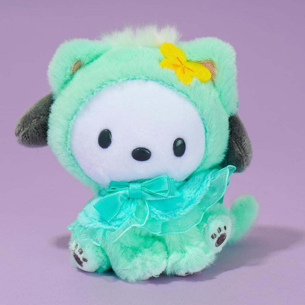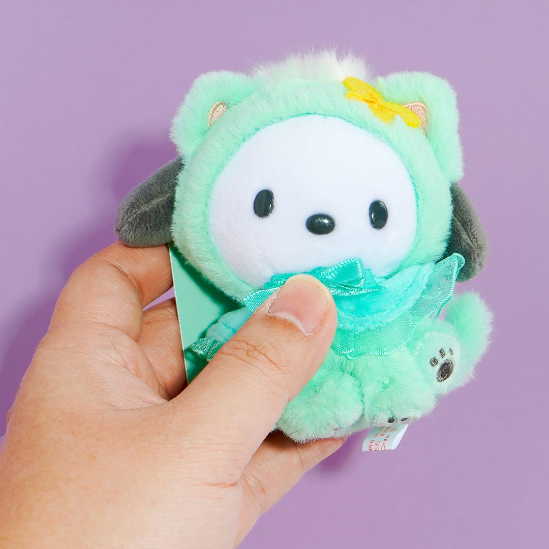 Have a blast playing with this super kawaii Pochacco plushie charm! This cutie comes in a cat hood costume with lace and ribbons. You can take it anywhere by attaching it to your fave travel bag!