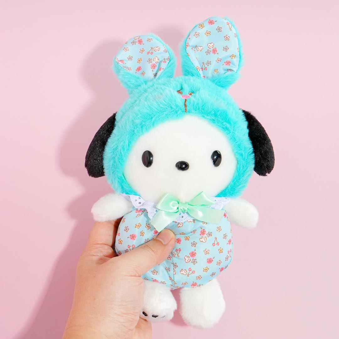 This super cute Pochacco plushie is wearing an adorable retro flower blue bunny onesie! Have fun playing together with this medium-sized cutie. You can take it along with you on strolls at the park.
