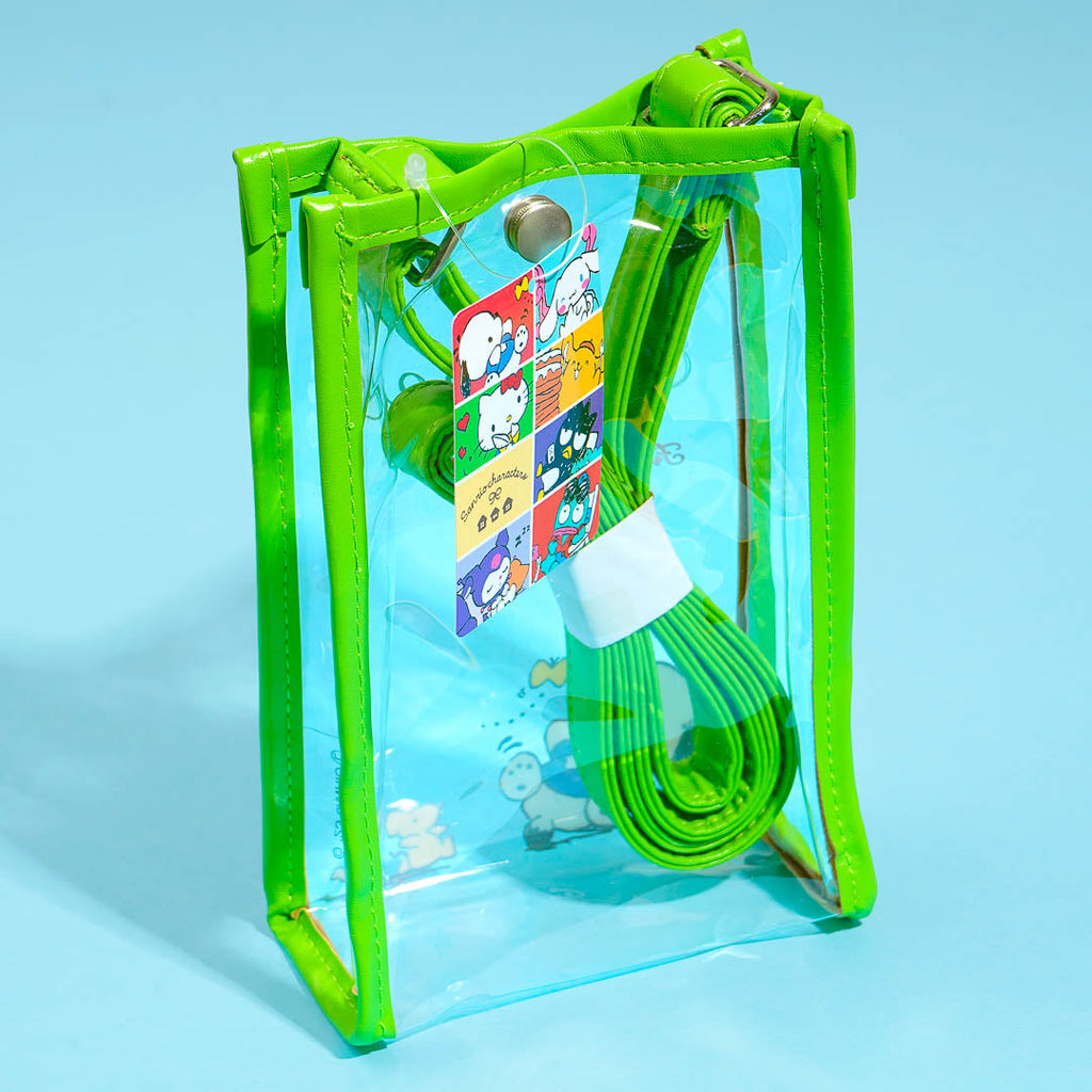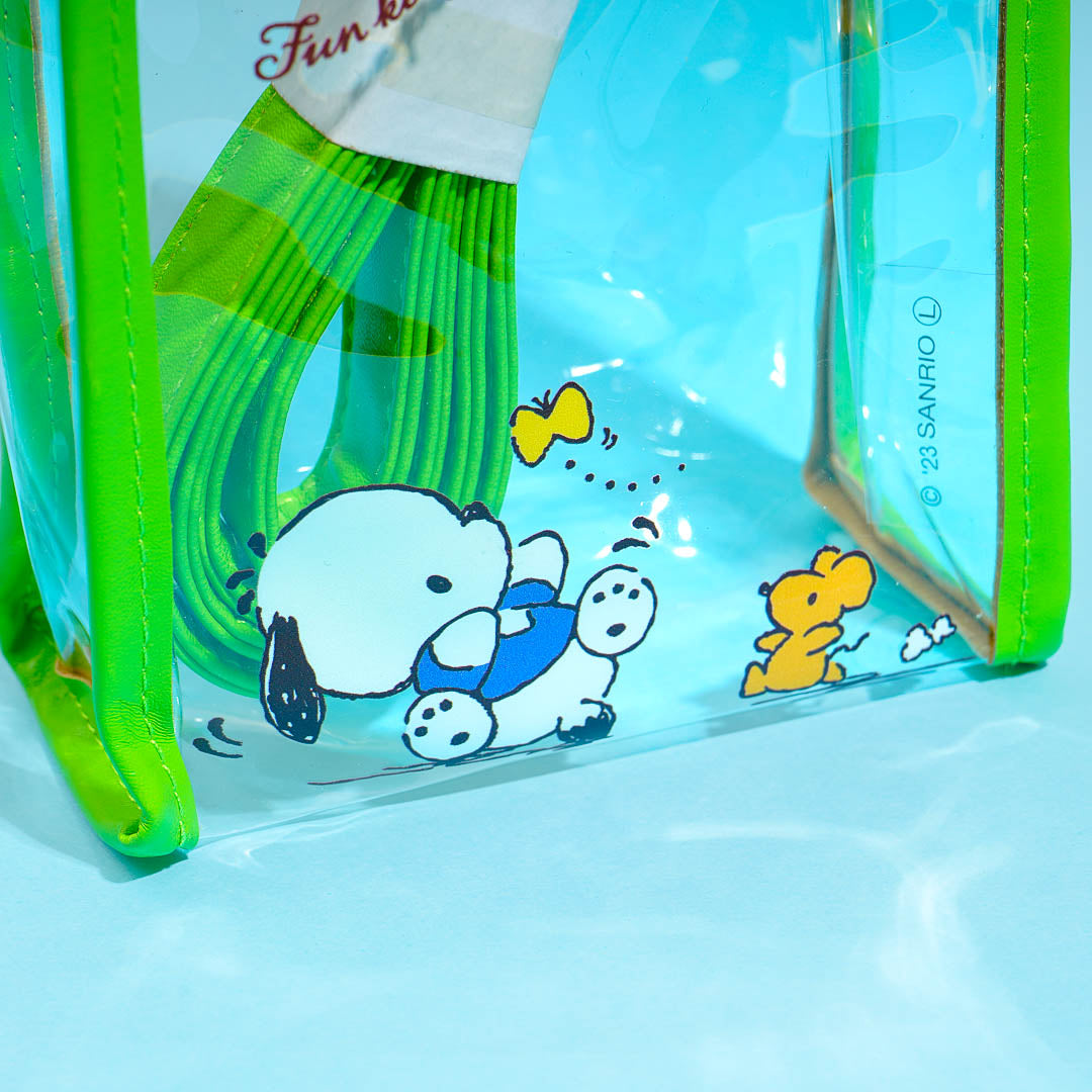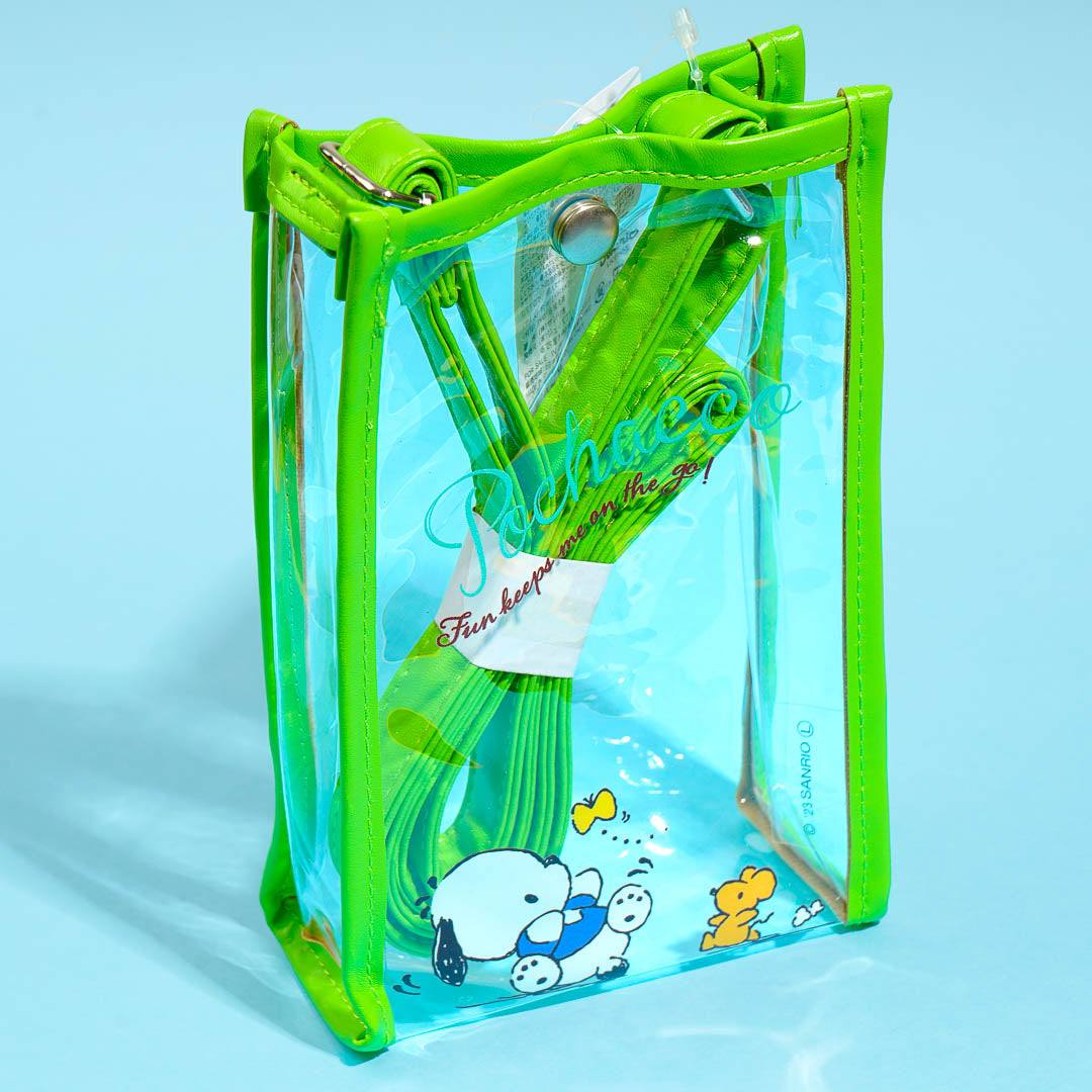 Use this clear shoulder pouch illustrated with a playful Pochacco to bring along your essentials! It's made of clear material that makes it easy to see what's inside. This pouch also features an adjustable shoulder strap and a button closure.