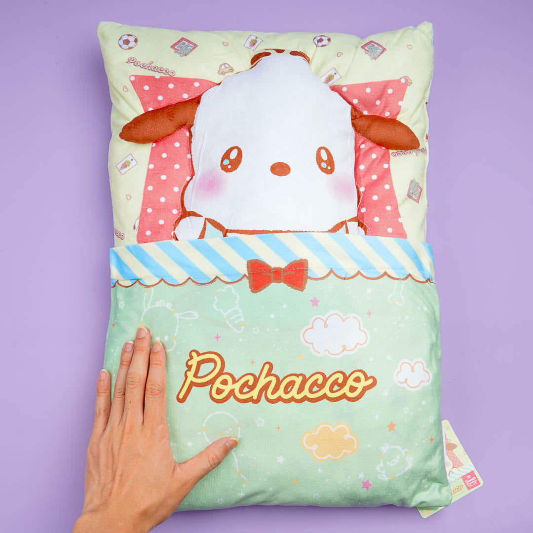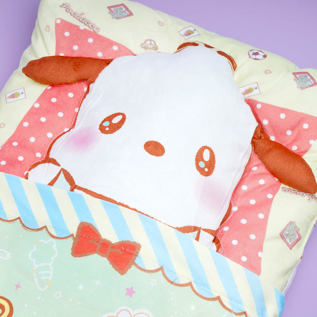 This kawaii cushion comes from the Sanrio Pukkuri Good Night series. It showcases Pochacco all snuggled up in bed! Place this cute cushion on your couch or by the side of your bed.
