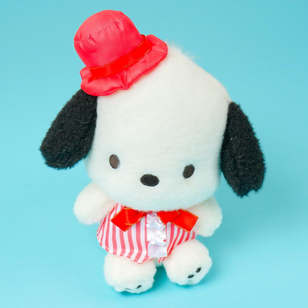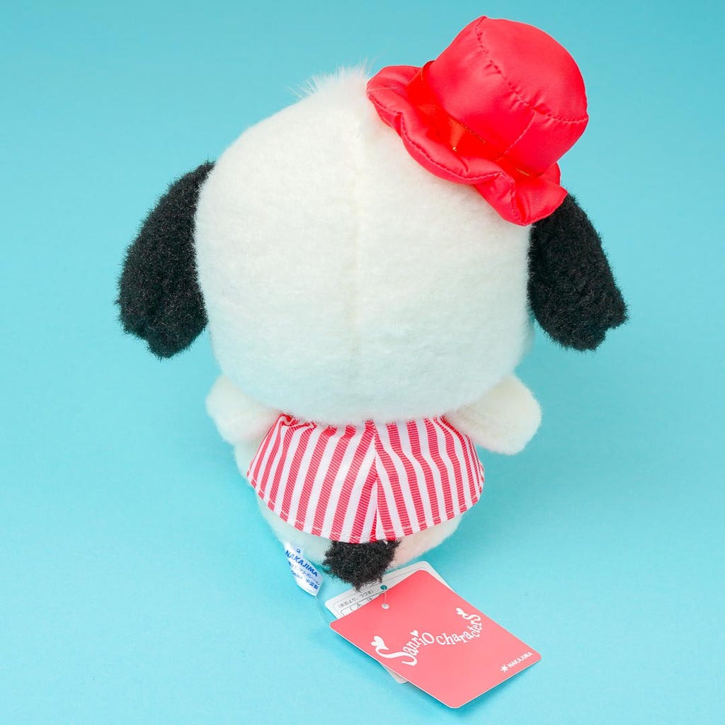 You'll absolutely love playing with this cute and fluffy medium-sized Pochacco plushie! It's wearing a formal striped vest with a matching hat and ribbon.