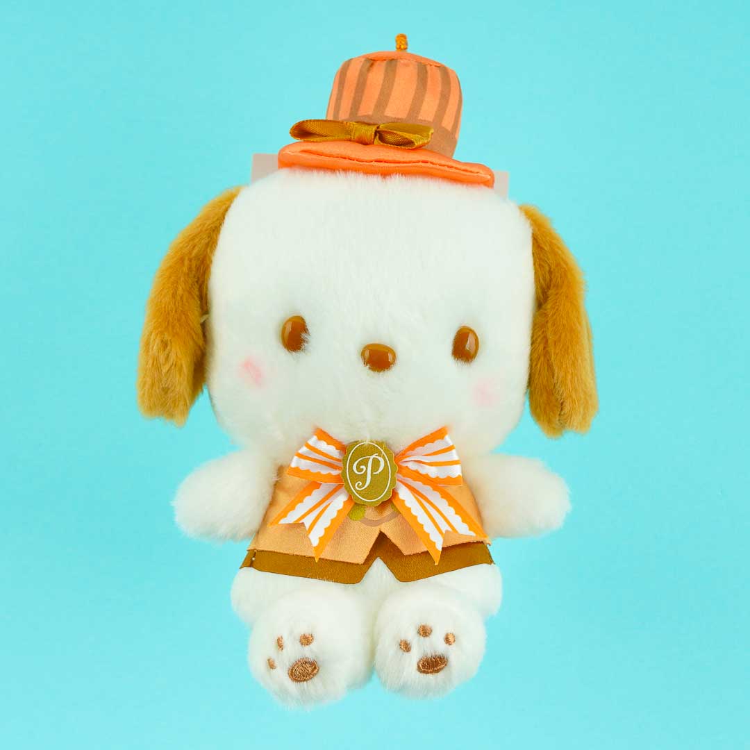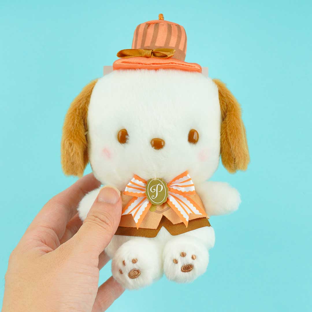 Add this cute Pochacco plushie to your collection! This medium-sized cutie is wearing a formal brown outfit with a matching hat — perfect for attending a tea party! You can also take it wherever you go by attaching it to your backpack.