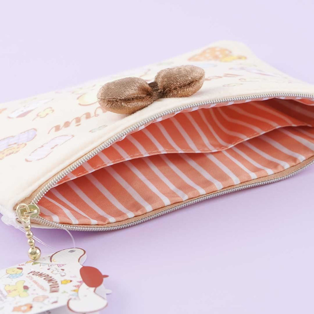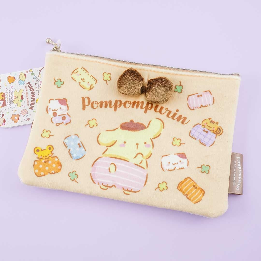 • A super kawaii zippered pouch with a fuzzy front side featuring Pompompurin and his many pants