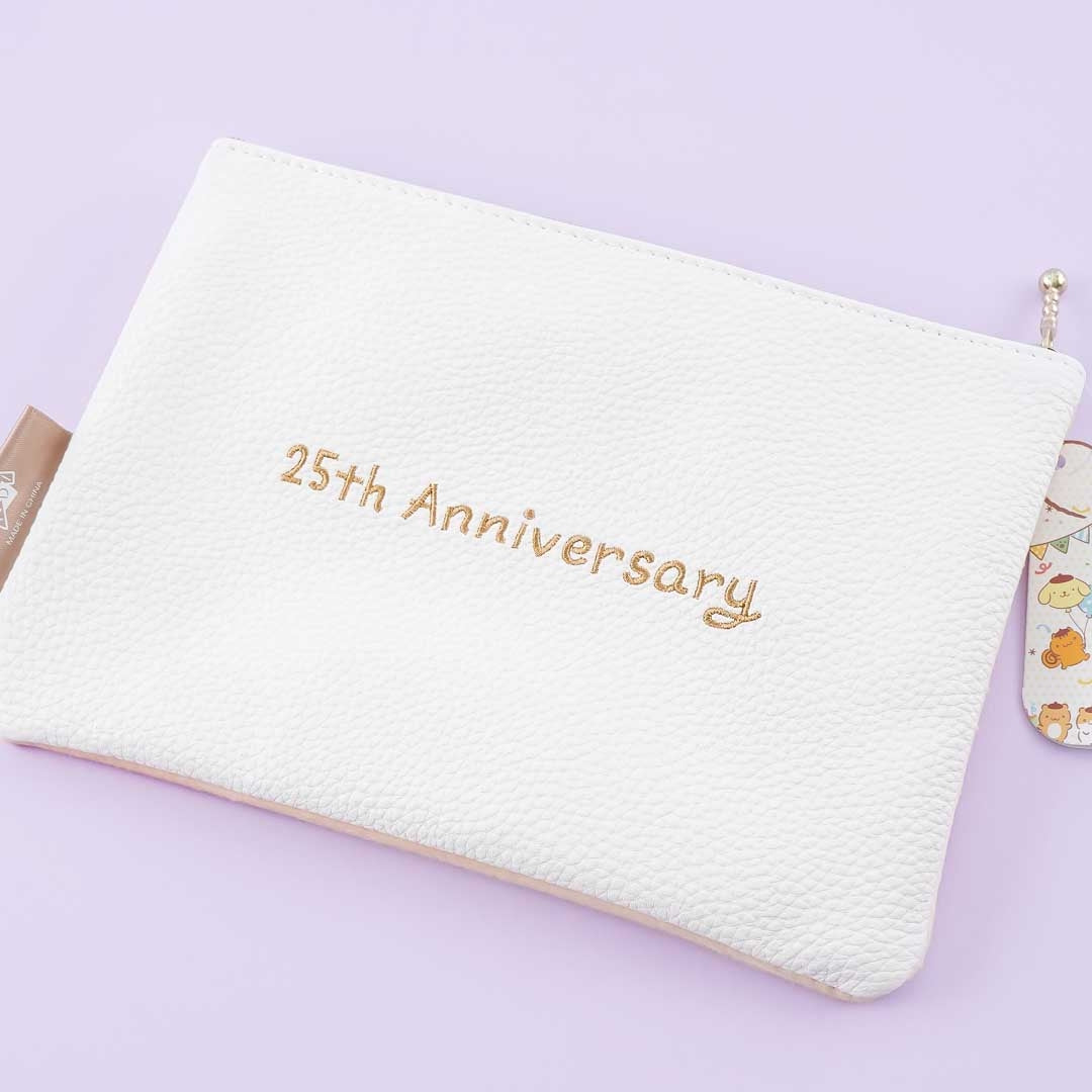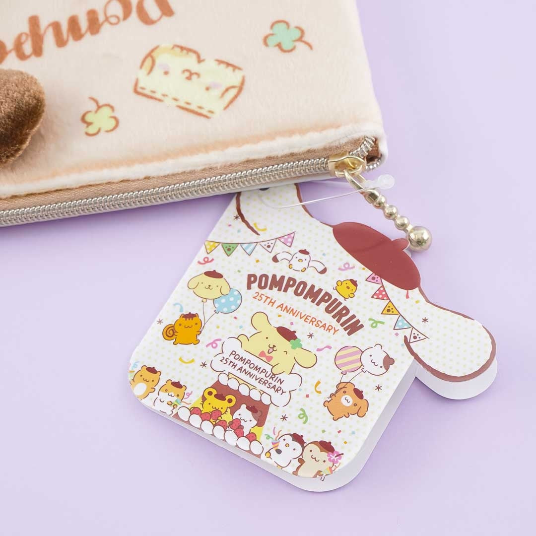This kawaii pouch has a fuzzy front side illustrated with Pompompurin showing off his pants. Its backside is made of synthetic leather and celebrates Pompompurin's 25th anniversary! You can easily organize your things inside this cute zippered pouch thanks to its striped inner partition.