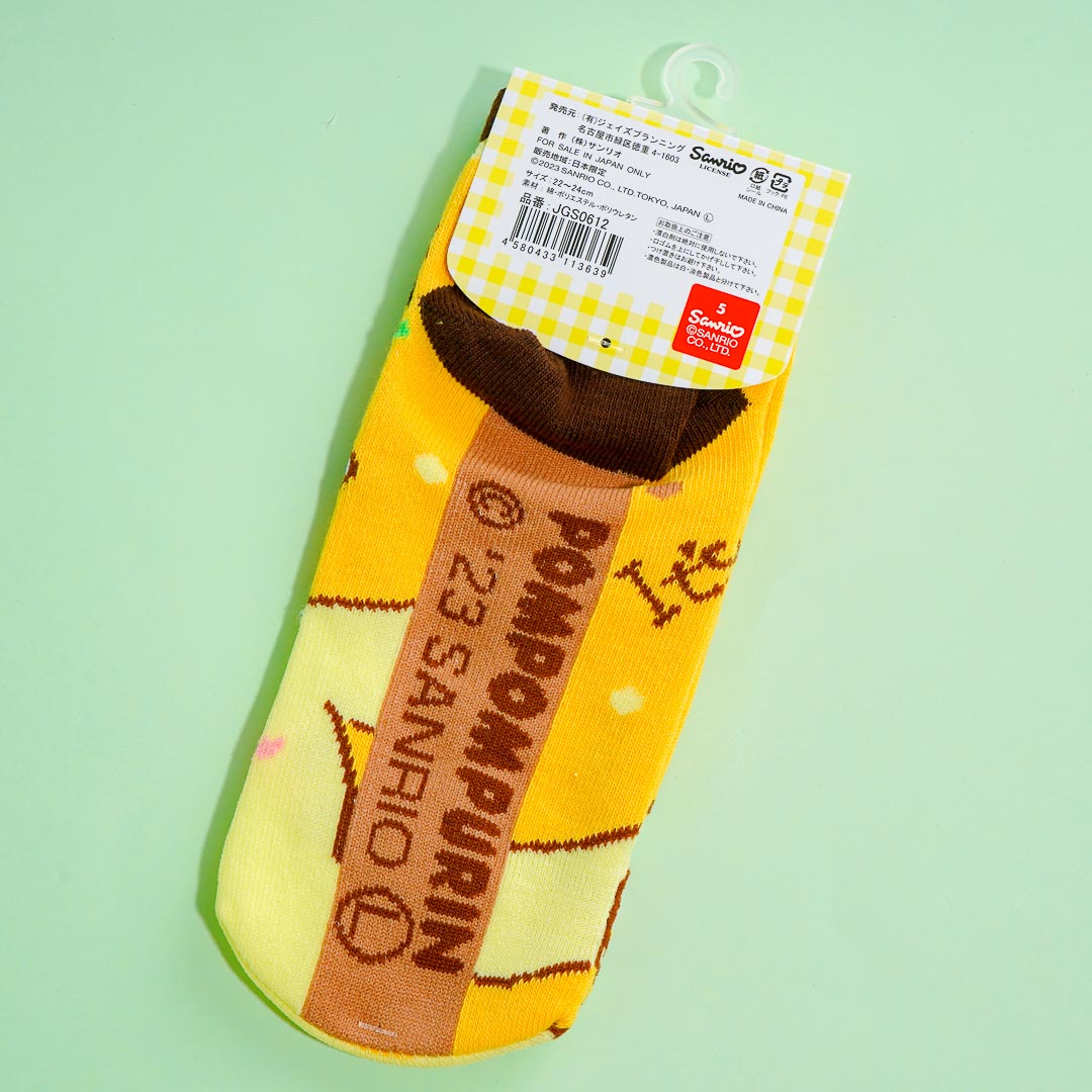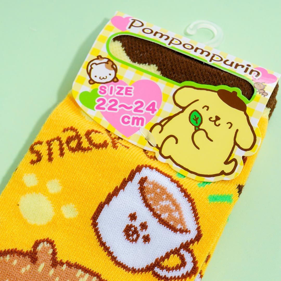 Kawaii-fy your outfit of the day by wearing these yellow jacquard socks! This super cute pair has colorful illustrations of Pompompurin having a fun break with coffee and donuts!
