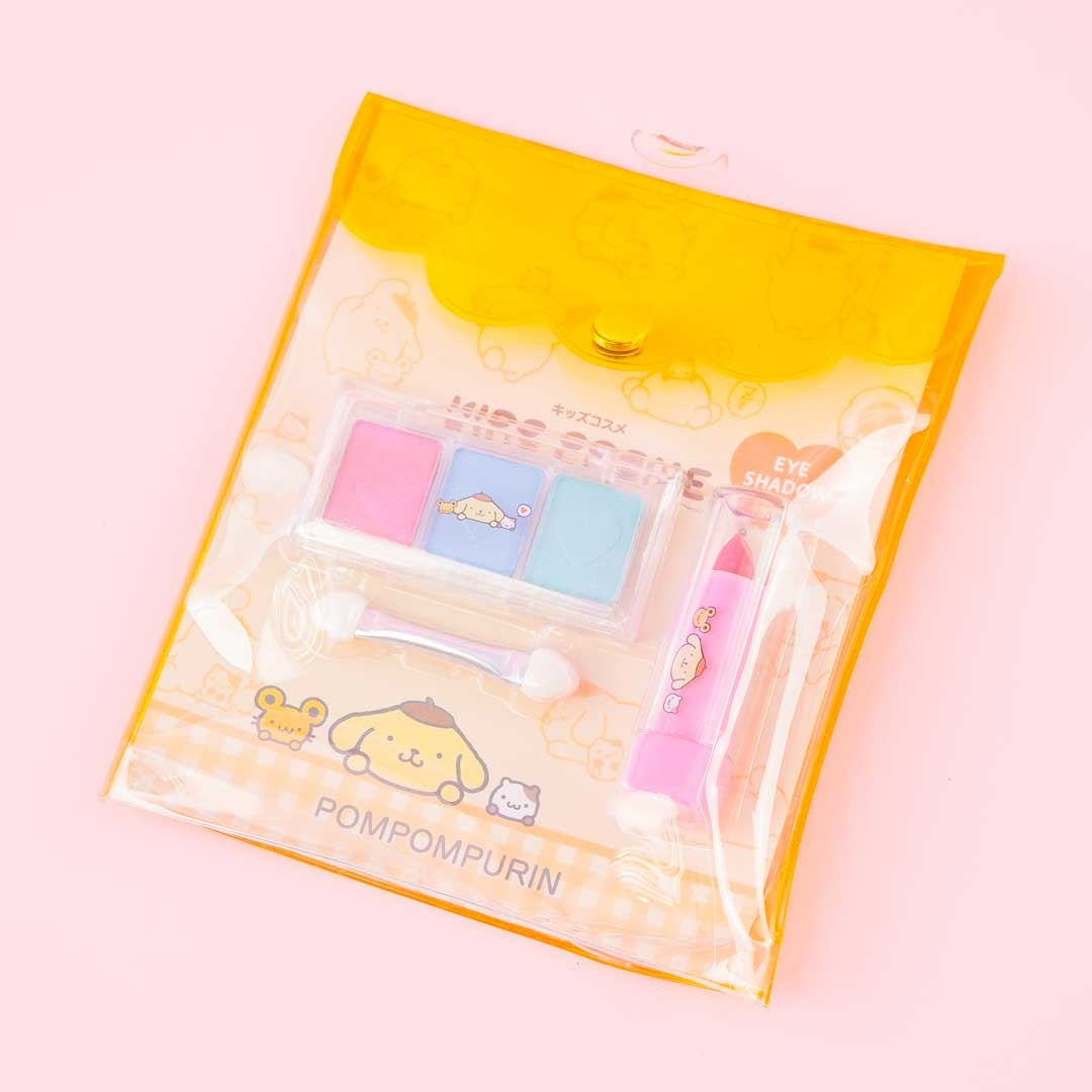 Kawaii-fy your look with this fun Pompompurin makeup kit! It includes a palette with a trio of eyeshadow shades: pink, mint, and blue! The set also comes with a tube of red lipstick, a mini eyeshadow applicator, and a matching clear carrying pouch. This kit is safe to use for almost all skin types and even for children!
