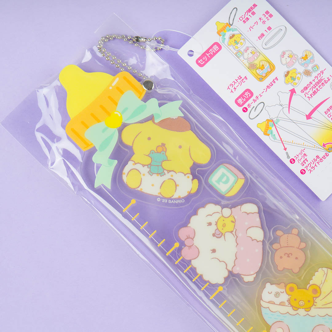 Jazz up your bag with this super cute baby bottle-shaped acrylic charm! It has decorations featuring baby versions of Pompompurin and his friends. These decors are removable so you can customize the charm's design!
