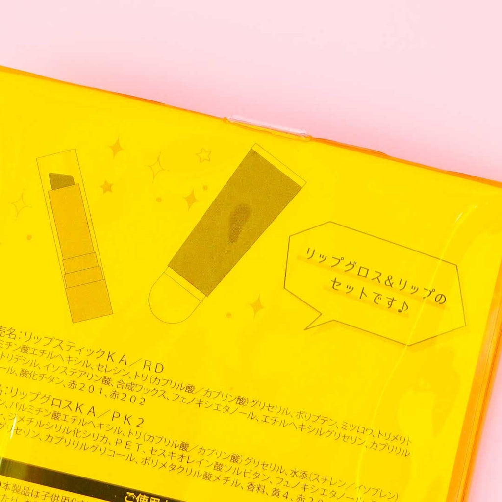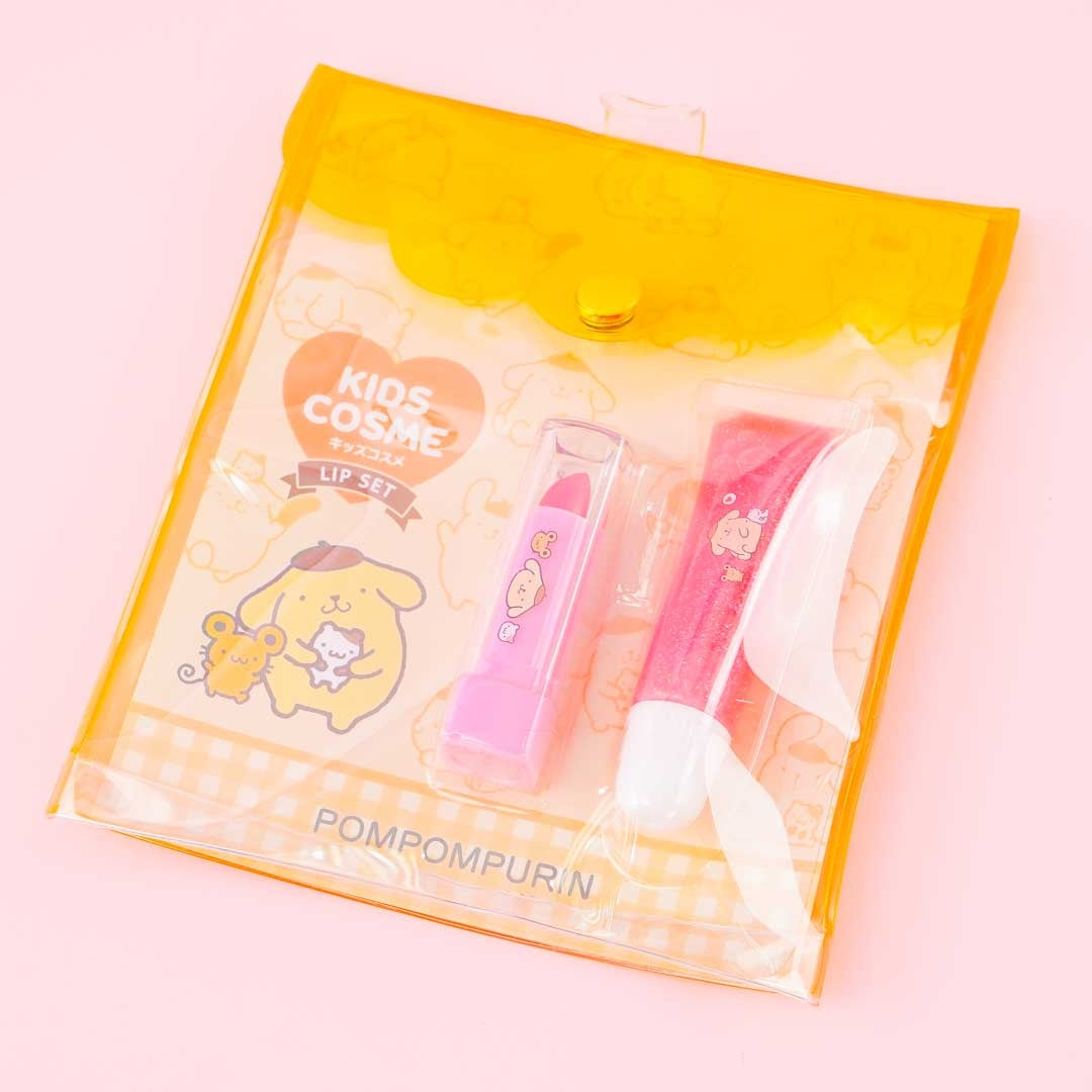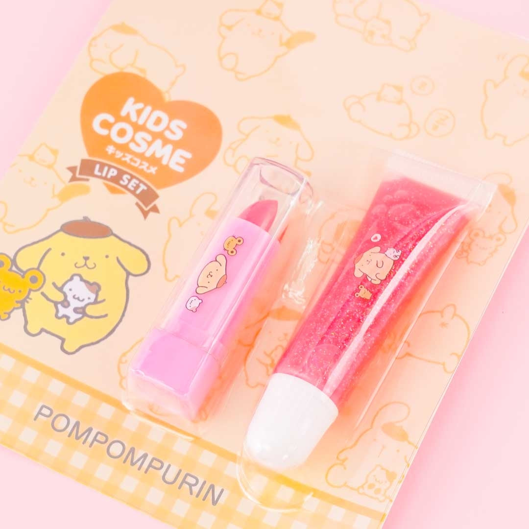A super kawaii kit consisting of a lipstick and gloss featuring Pompompurin with his friends