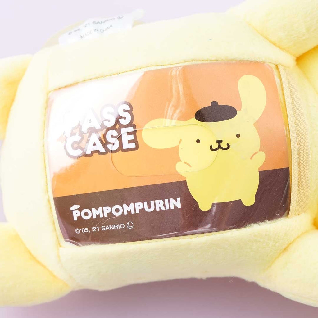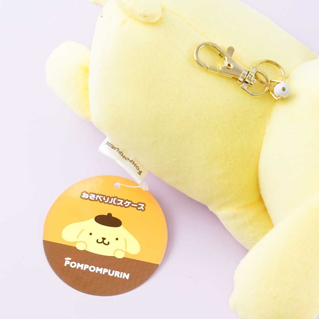 A super cute Pompompurin plushie pass case that's lying down flat on its belly
